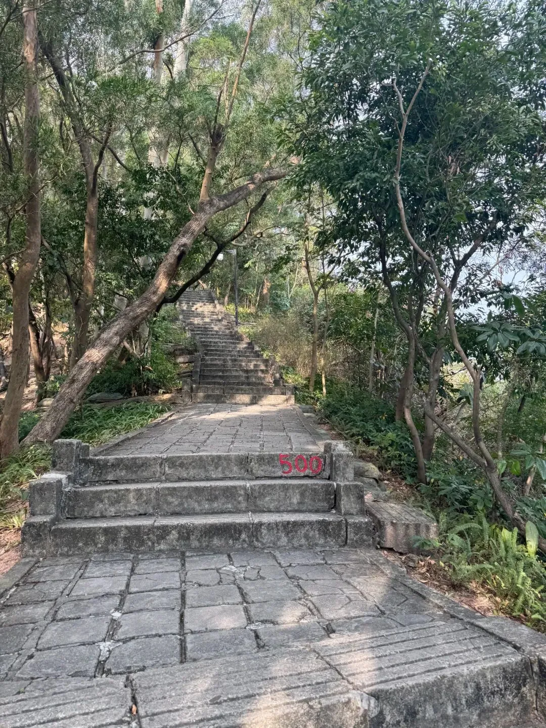 南山海拔300米出头,通往山顶的路也有很多条,一般是走车道上山,但是女神去年下半年伤了脚,爬了太多次车道,这次建议我们走台阶路上山,这条路没那么晒。她不推荐野路,一来被掉进后颈的毛毛虫蛰过,二来经过人家荔枝园会有狗。于是约了九点从海关登山口出发,上去一共1200级阶梯,每过100级阶梯就有数字标记,女神连每一级阶梯都是清楚的,还经常看到半山腰的一只胖胖红松鼠,甚至在疫情时还在山上见过受伤的红腹锦鸡——我以为红腹锦鸡是生活在四川的。这座山给人的印象是有很多桉树,就是冬天会把树皮脱得光溜溜的那种,我也不确定是不是白千层。