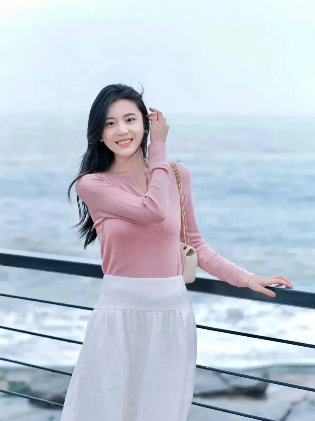 颜色.搭配是浅.粉色.和白色.。这两种颜.色放在一.起,.特别柔和。.和海边的.蓝天白.云特别.配。看.起来干干.净净.的,.又很温.柔。整.个人像是融.进了海边的.景色里.,舒服又.自然。