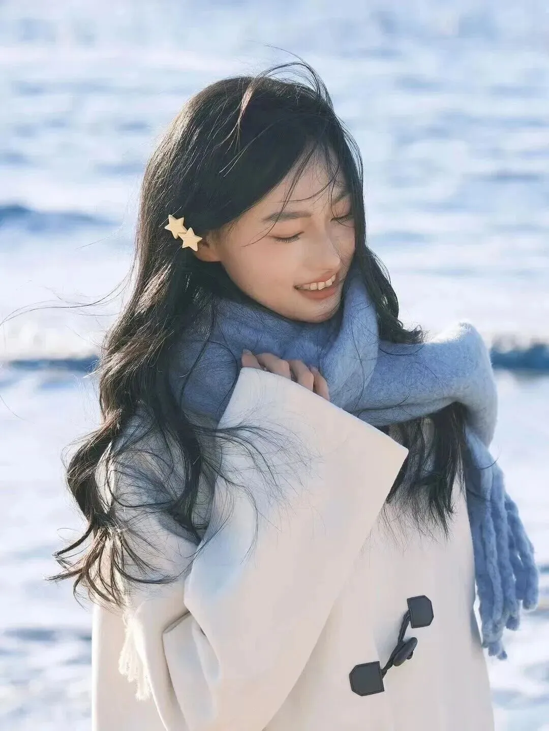 拍近景时,把围巾往脸颊旁贴一贴,手指轻搭在围巾上。头微侧对着镜头,不用咧嘴大笑,轻弯嘴角就够温柔。海风带来的发丝凌乱,让画面少了刻意感,像裹了层冬日暖调滤镜。