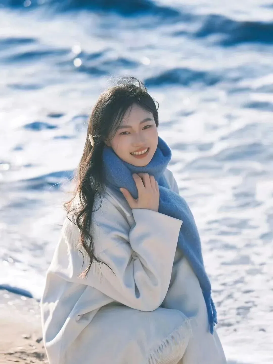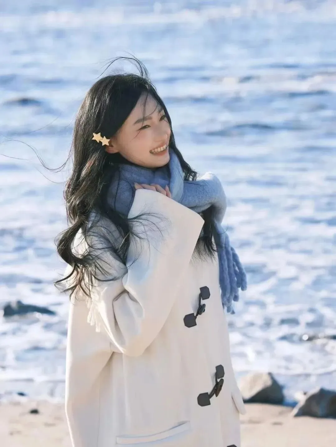 身体转向侧面,肩膀微微下沉(别耸肩显拘谨),一只手搭在围巾上,让大衣肩线自然露出。头轻转镜头方向带笑,海风把头发吹乱时,冷调海水衬得人更柔和,松弛感和氛围感同时拿捏。