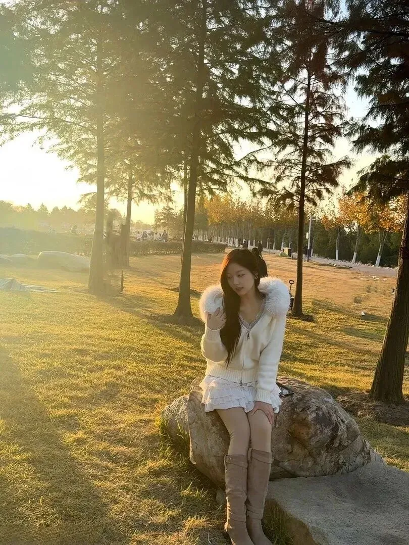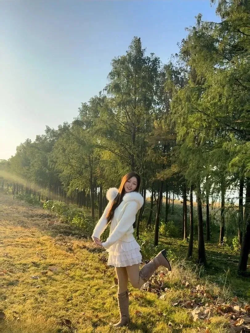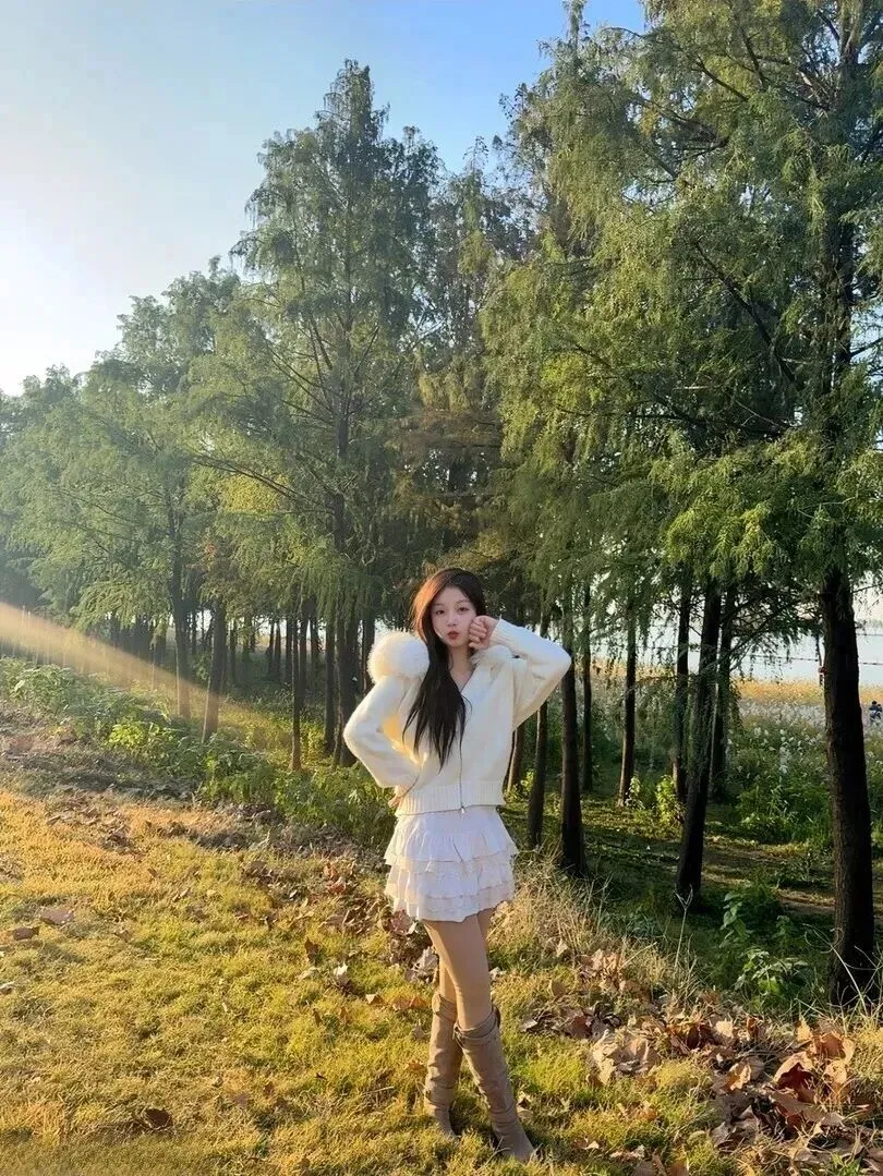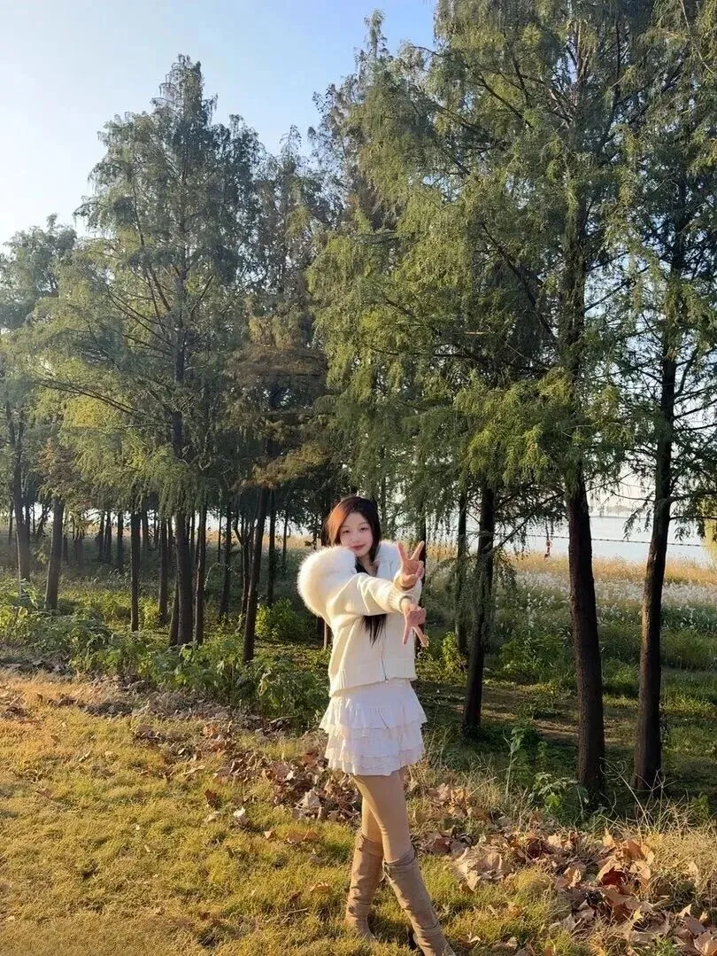 .起来还.是上周在.公园.拍照时发.现的.。那.天阳光特别.好,看见一.个女.孩蹲.在长椅.旁边捡.落叶。她.穿着.米白色的毛.绒领开.衫,风一.吹,裙摆.轻轻飘.起来,.那种温.柔的感觉.一下子就.把人吸引.住了。
