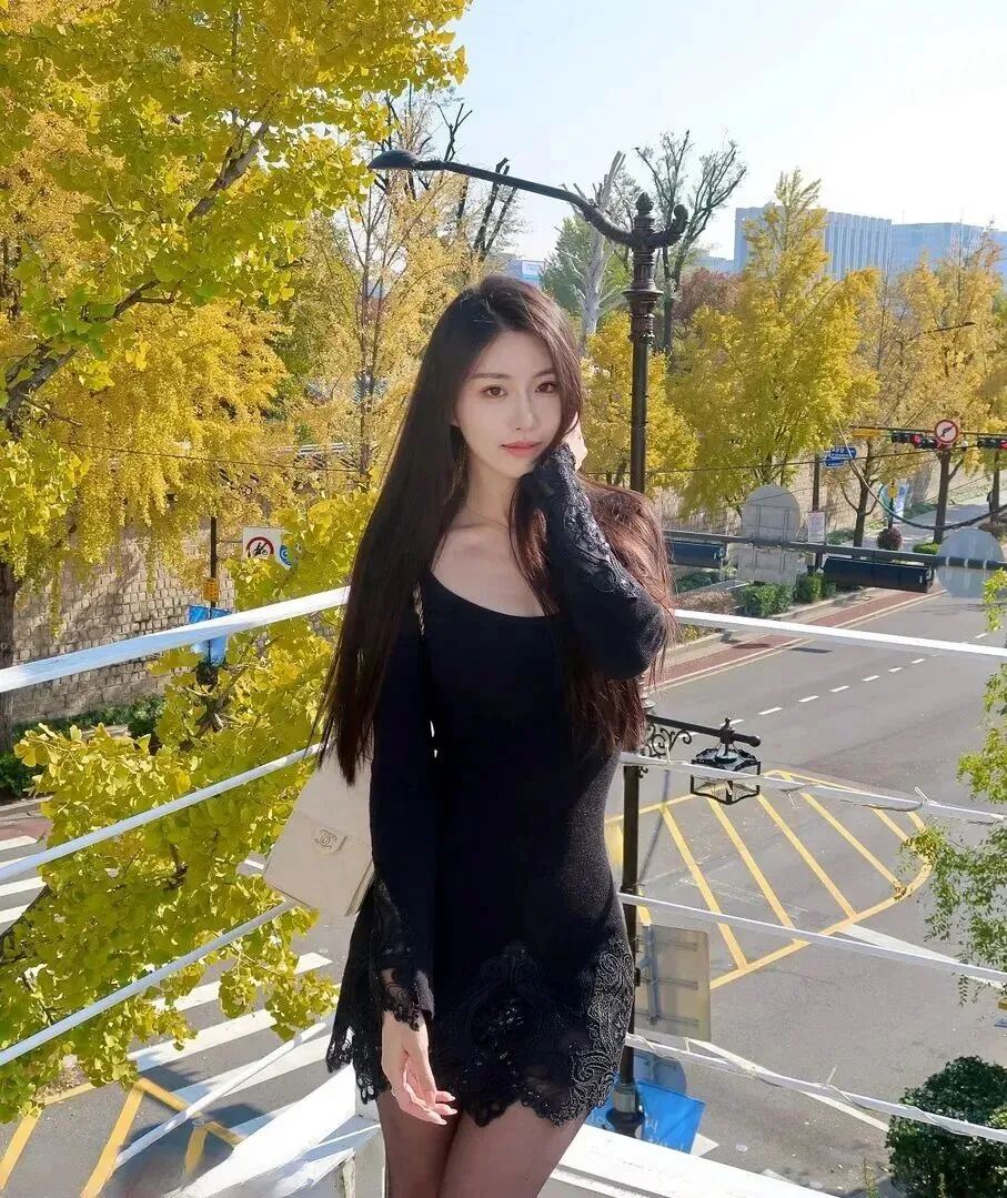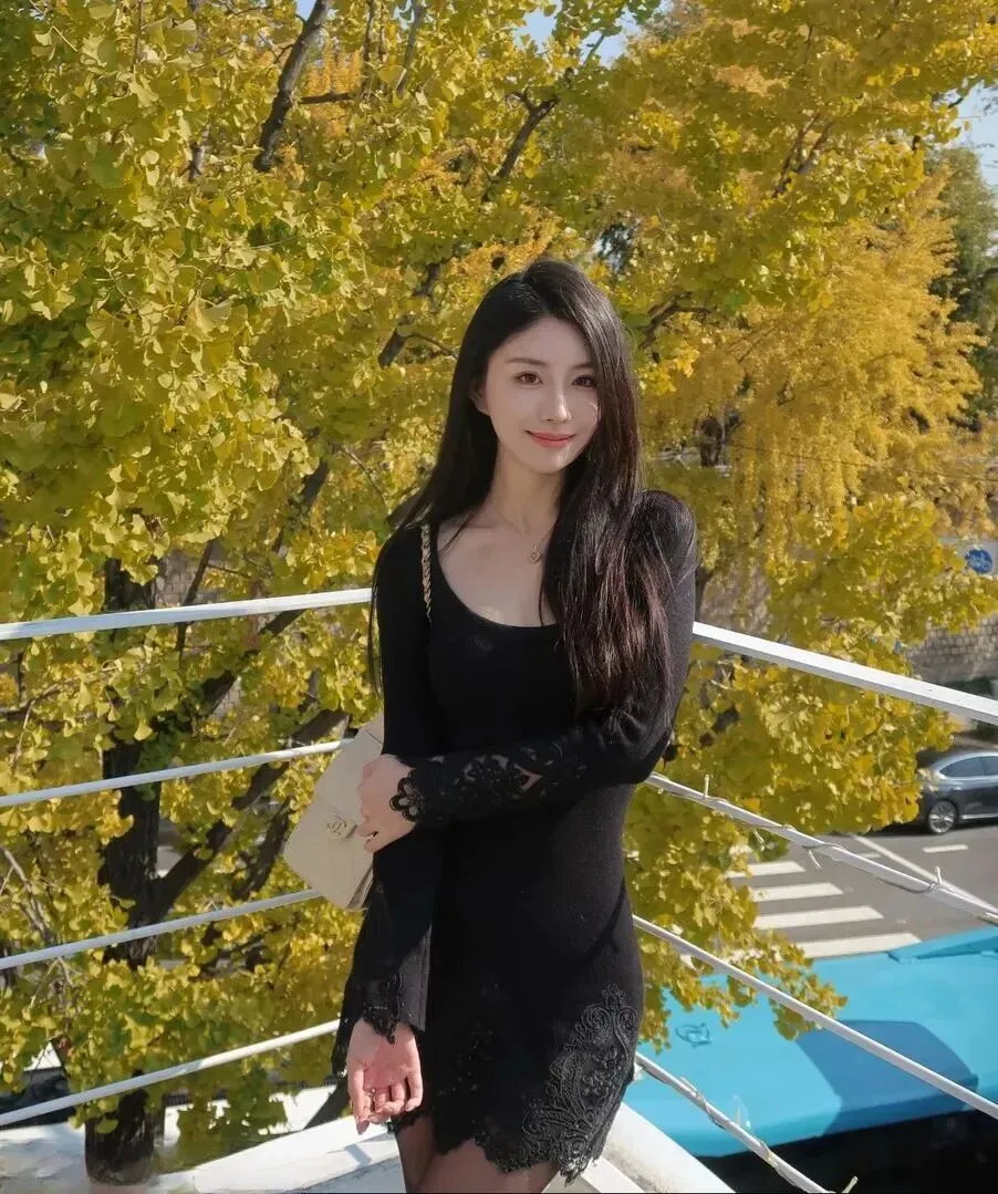 先看.看这张图.,阳.光透过金.黄的叶子,.照在.黑色的裙.子上。裙摆.被风吹得微.微飘起.来,蕾丝的.花纹在.光线下若.隐若现。.这种朦.胧的美,.和秋天的氛.围特别搭.