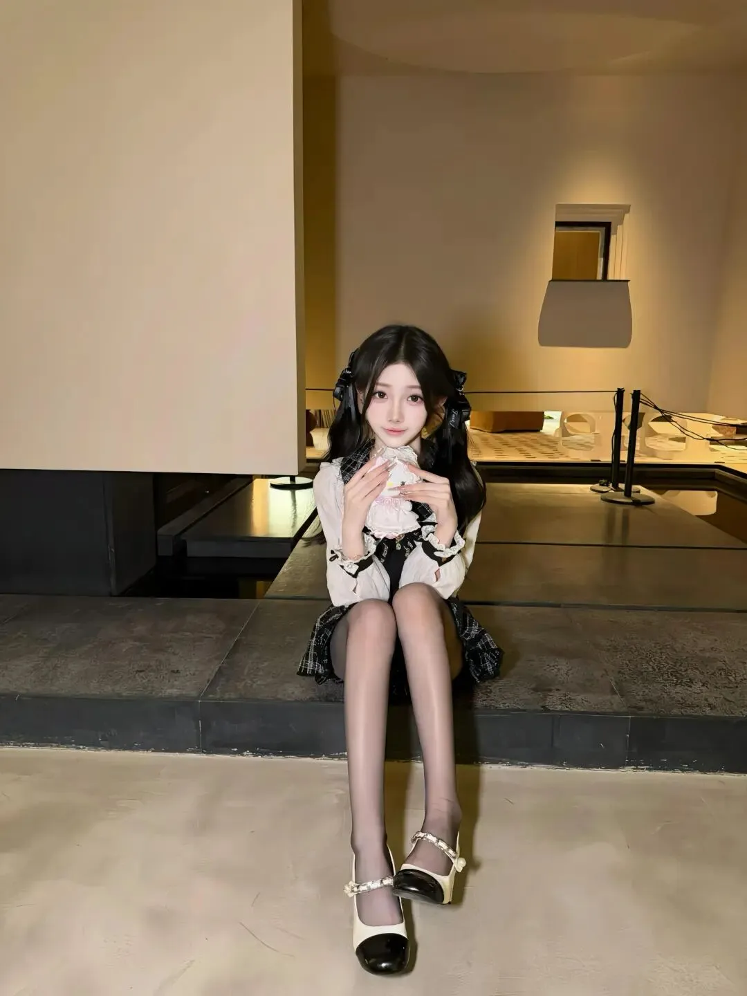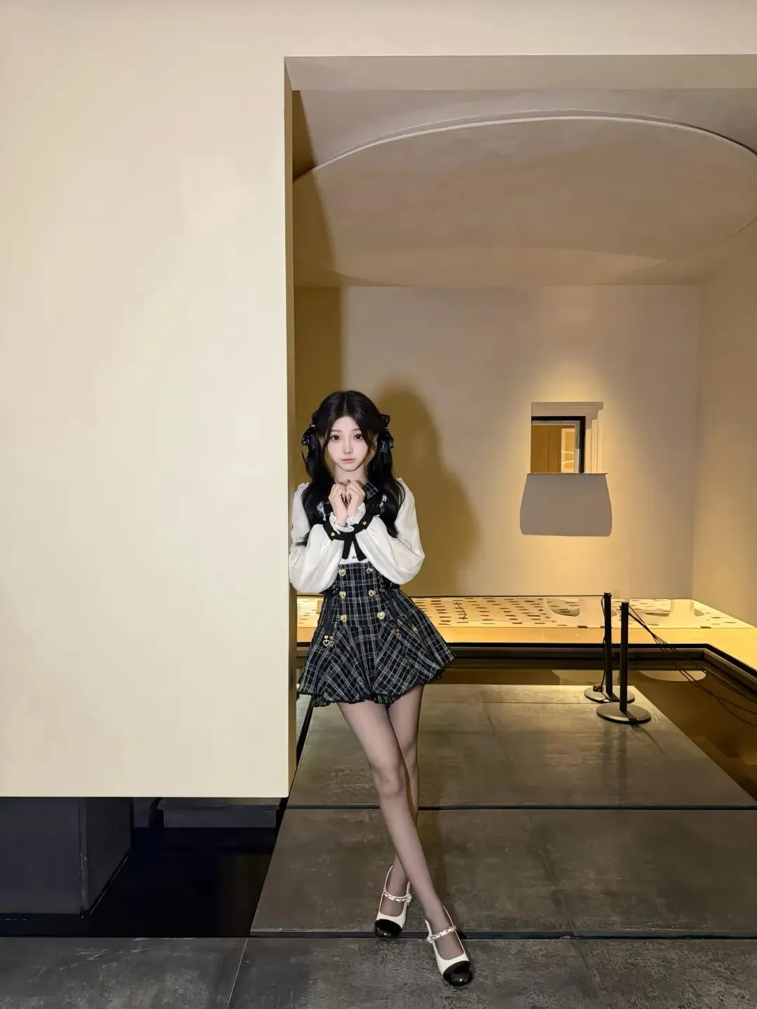 上身是白衬衫打底,领口与袖口的蕾丝花边带着复古的甜意,外搭黑白格纹的短款马甲与同面料的百褶短裙,格纹的肌理在光线下呈现出细腻的明暗层次,剪裁利落又带着学院风的俏皮。马甲的金色纽扣像细碎的星子点缀在面料上,短裙的长度恰好落在大腿中部,随着动作漾起轻柔的弧度。脚上的玛丽珍鞋是黑白拼色,漆皮的亮面与哑光的鞋身形成质感碰撞,细带缠绕着脚踝,让每一步都带着优雅的韵律。