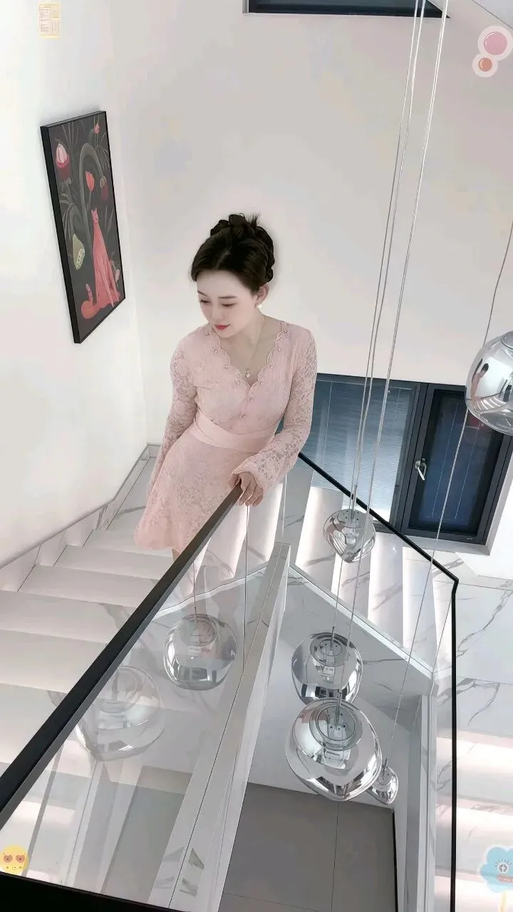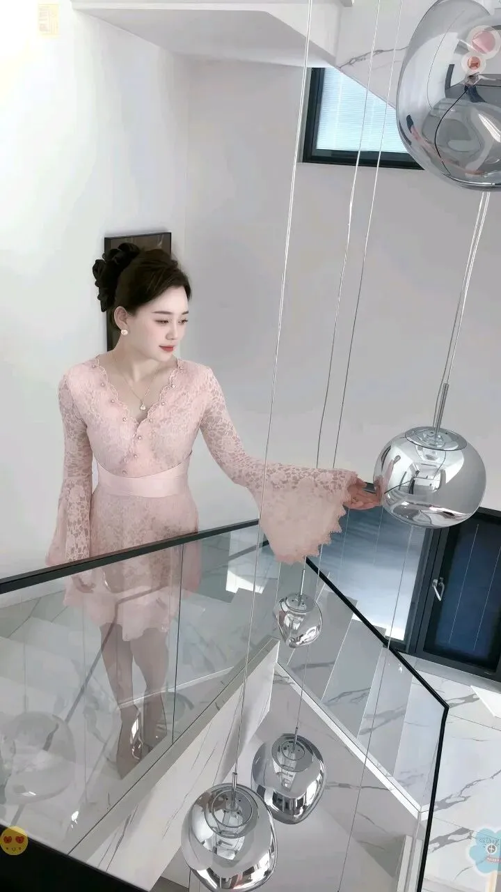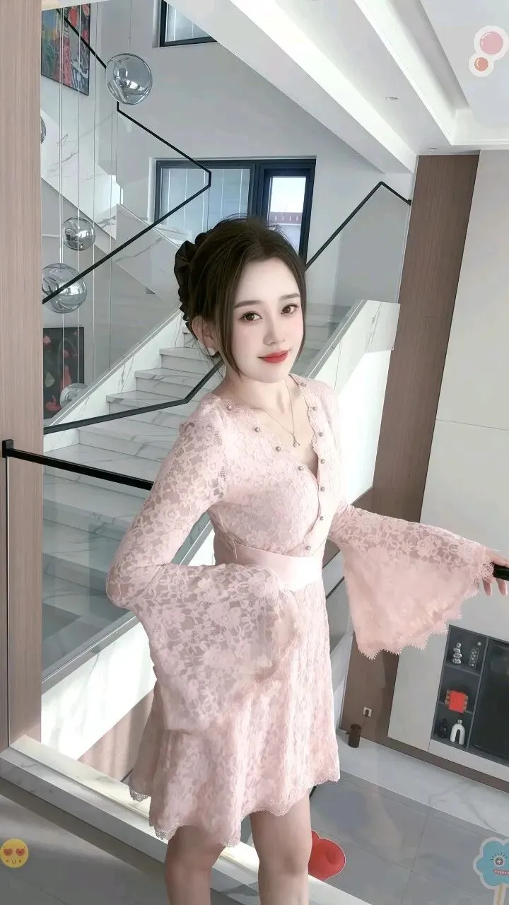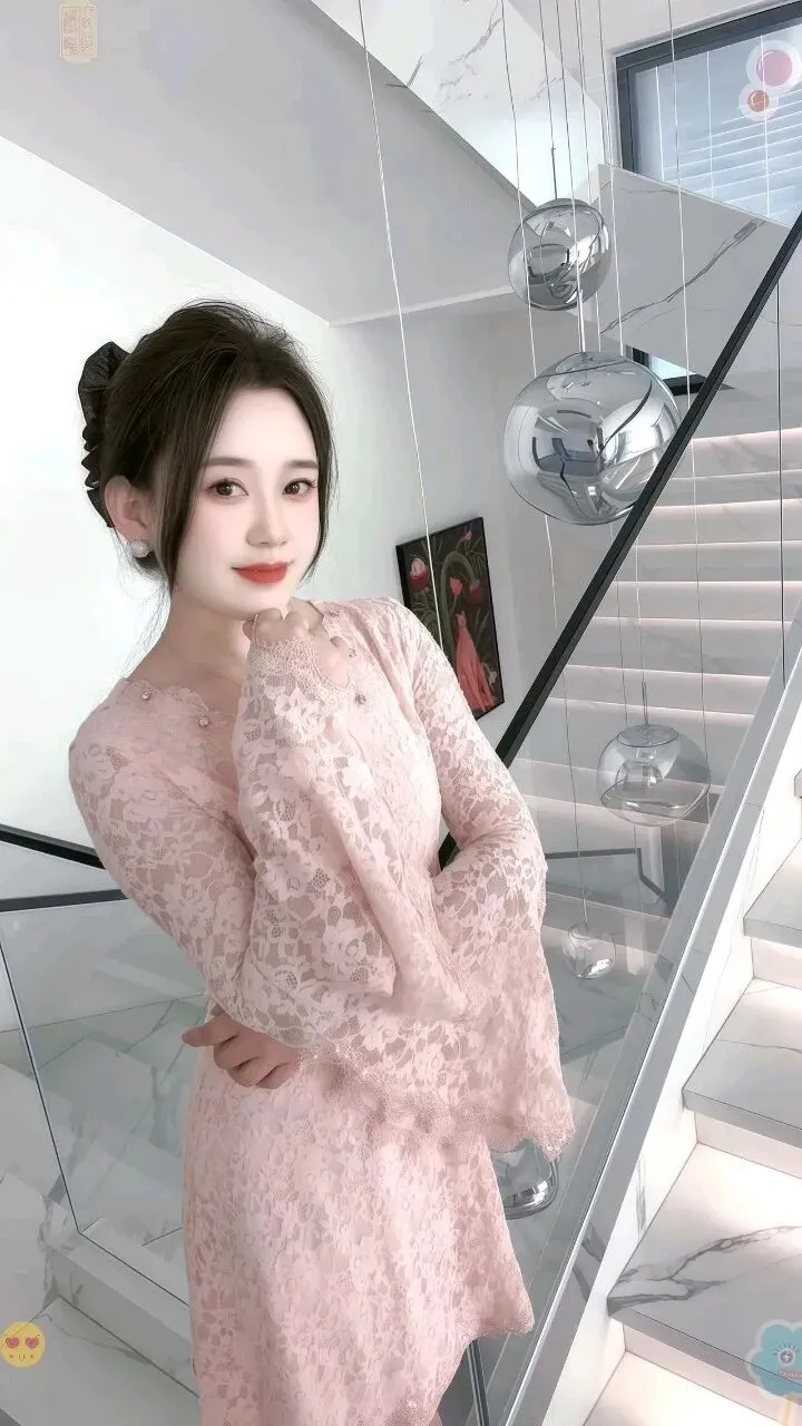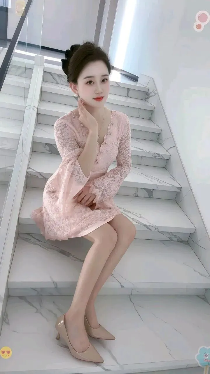 你看这一身,淡粉色蕾丝裙裹得刚刚好,V领+收腰设计,把肩颈线条和腰臀比例都衬得绝绝子;喇叭袖的蕾丝边软乎乎的,自带“娇俏滤镜”;再踩一双裸色高跟鞋,腿直接从脚踝“拉长”到腰,整个人又甜又有气质,往楼梯间一站都像在拍画报~