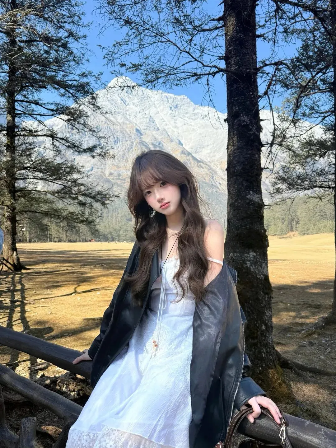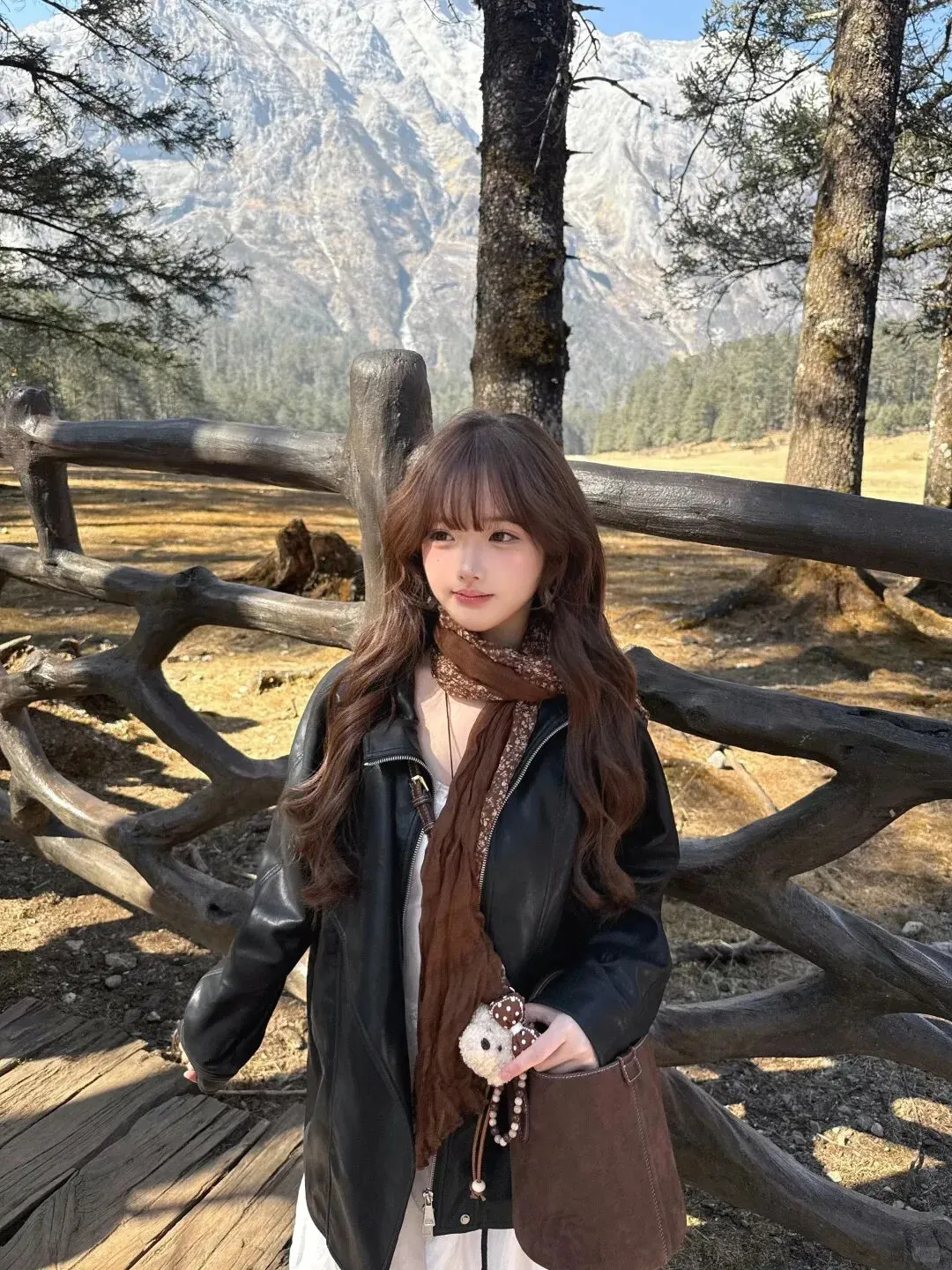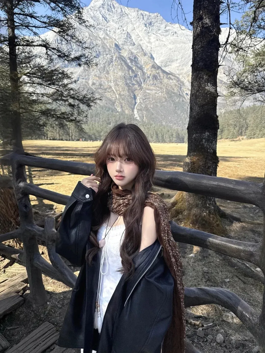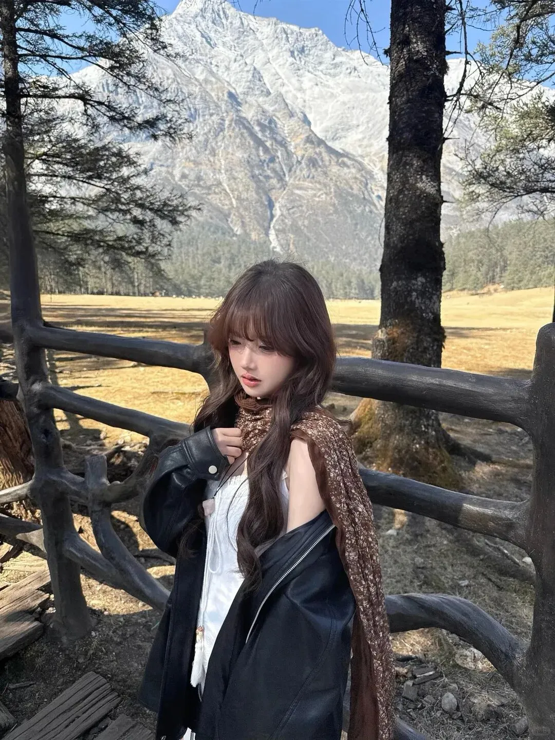 里低头整理围巾的那一秒,像在把散乱的心也顺一顺,黑皮衣的宽大让她看起来不再脆弱,白裙的细节又提醒人她仍然柔软,棕色把一切拉回现实:你可以浪漫,但不能失去落地的力量;她抬头时,雪山仍在,树影仍在,木栏杆也仍在,唯一不同的是她的气质被围巾轻轻改写——从“仙气”变成“故事感”,从“好看”变成“耐看”,像你读过的那种女主:不急着讨好镜头,只是在自己的季节里站稳;她最后干脆把皮衣穿得更完整一点,拉链不拉,任它敞开,让白裙的蕾丝边从里面透出来,棕色围巾垂成一条纵向线,把身形拉得更修长,棕包在旁边像一个稳稳的句号——她忽然明白穿搭最迷人的地方,不是把人变成某种模板,而是你可以用同一条白裙,先在雪山下做一场甜酷反差的梦,再用一条咖棕围巾把梦收回来,变成可以带走的生活;风又起的时候,她不再躲,她让围巾的尾端轻轻飘起来,像对这片山野打招呼,也像对自己说:下一次,不管去哪里,我都能用“白裙打底、皮衣定调、围巾收尾”的方式,把自己穿得更清醒、更温柔、更有力量。