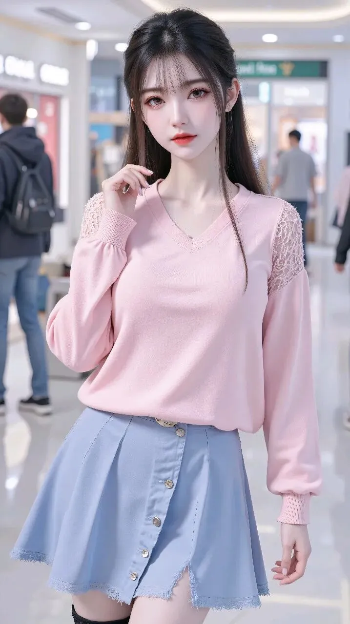 她今天穿了件浅灰色的针织衫,搭配米色长裤和平底鞋。