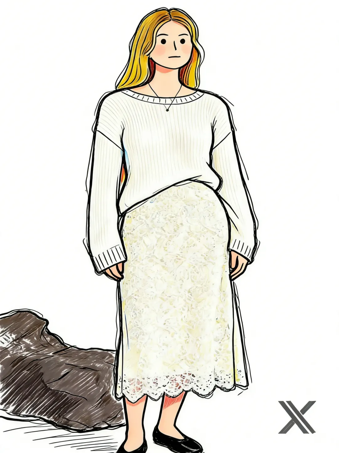 蕾丝针织衫搭上A字半身裙。适合喜欢优雅风格的人。修身的蕾丝针织衫配上A字半身裙。优雅又显瘦。把上衣下摆往裙子里面塞一些。露出腰线,比例就好。有垂感的裙子最好,走起来很有范儿。