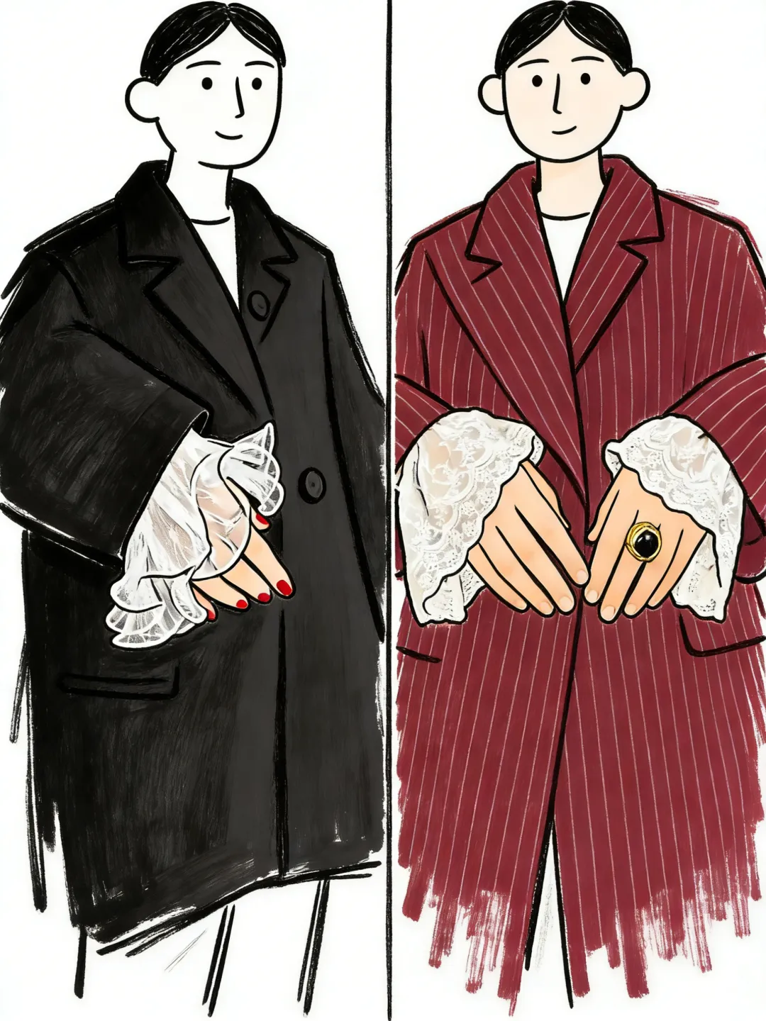 第二是有女人味。年纪大了,做事也比较有经验。但是有时候太强硬了。穿点蕾丝可以平衡一下。穿西装外套的时候可以内搭一条蕾丝背心。穿有蕾丝袖口的衬衫也很美观。既有力量又有温柔的感觉。