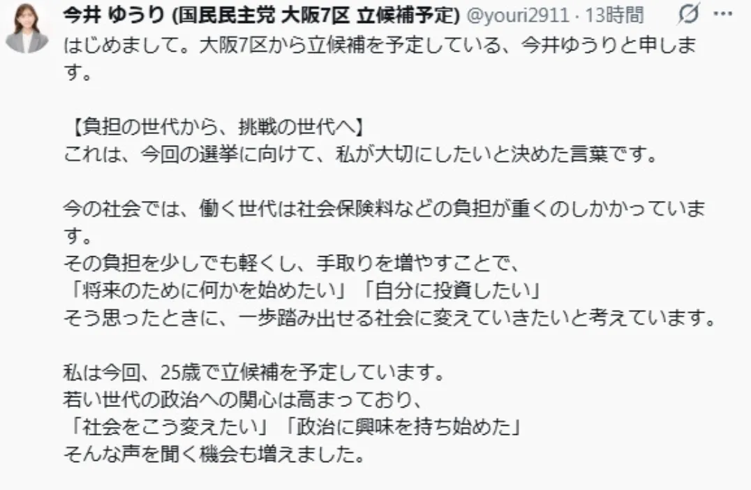 “大家好。我叫今井由里,我计划参加大阪府第七选区的众议院选举。”她写道,并附上了一张自己的照片。 “从背负重担的一代到面临挑战的一代,这是我决定在竞选期间铭记于心的一句话。在当今社会,劳动一代背负着沉重的社会保险费和其他开支。我希望通过减轻他们的负担,哪怕只是一点点,并提高他们的实际收入,来创建一个让人们在想要‘为未来做点什么’或‘投资自己’时,都能迈出第一步的社会。”