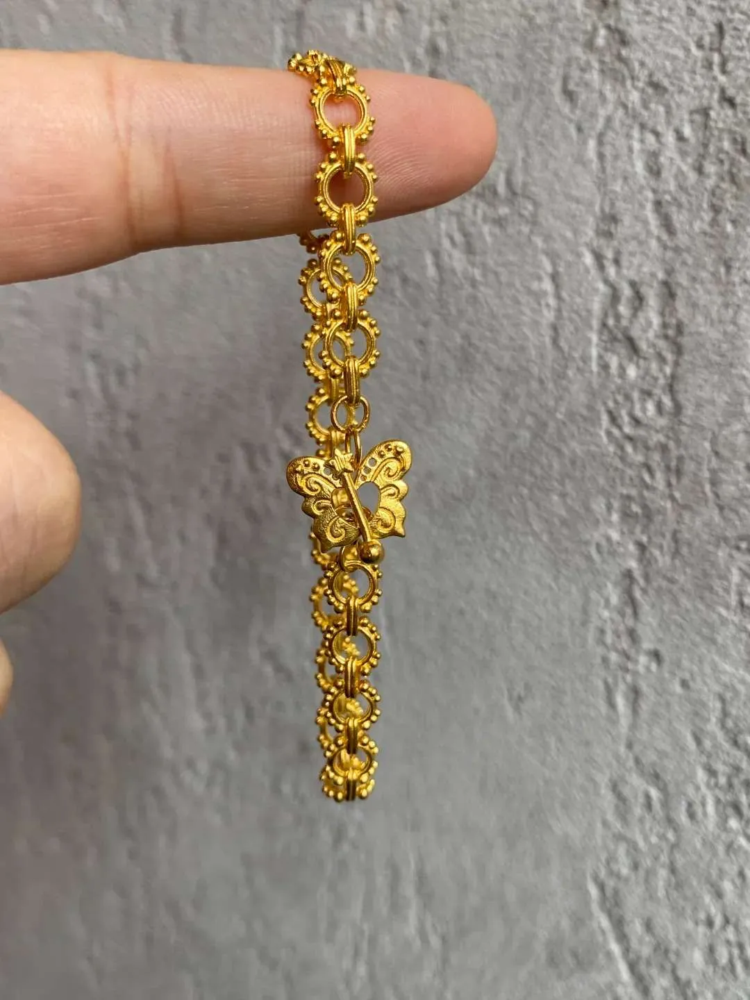 先说下它长什么样吧 这条是足金的蕾丝手链 整条链子是一个一个的小圆圈连起来的 每个圈外面还有一圈小金豆 那种微微鼓起来的颗粒感 很像小时候蕾丝桌布边上的花纹 但是换成了金色 质感一下就高级了 那种复古宫廷感 是你随便戴个白衬衫 也自带故事背景那种