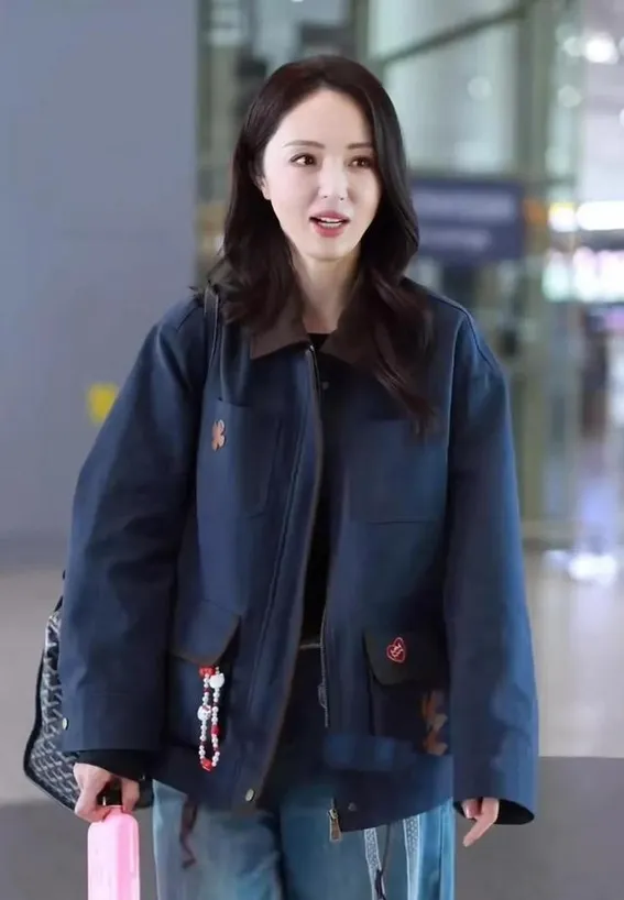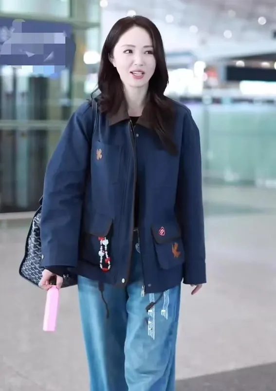 45岁董璇机场私服真会穿!夹克外套+蕾丝腰带+牛仔裤,时髦又高级