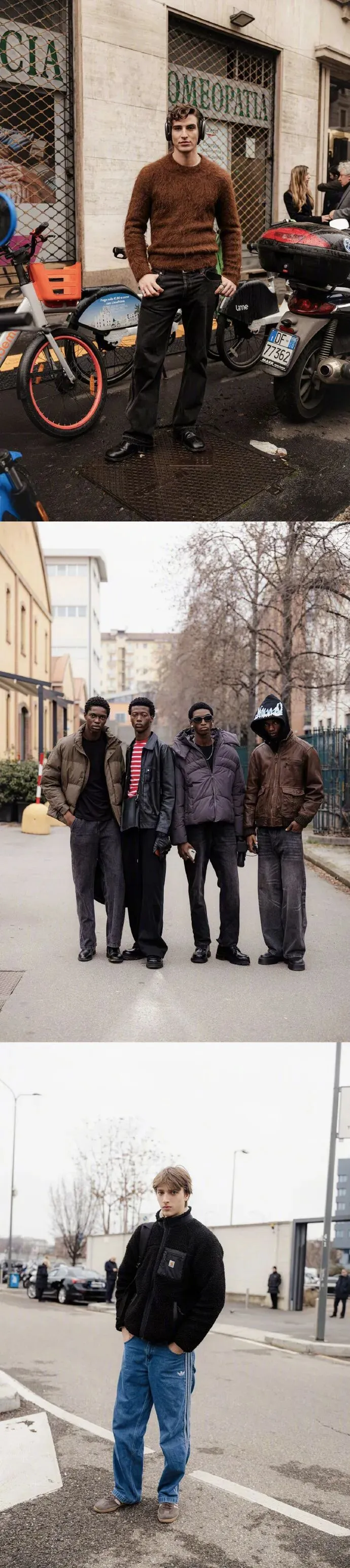 这次街拍虽主打 “简单随性”,却暗合米兰男装周 2026 年春夏(SS26)与秋冬(FW26)两季的趋势脉络: