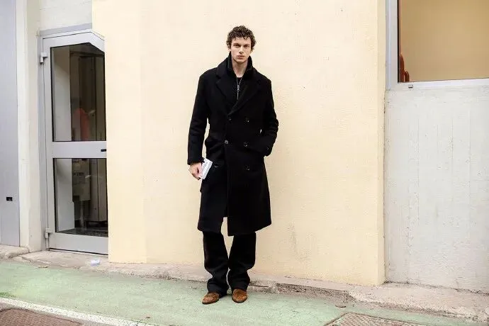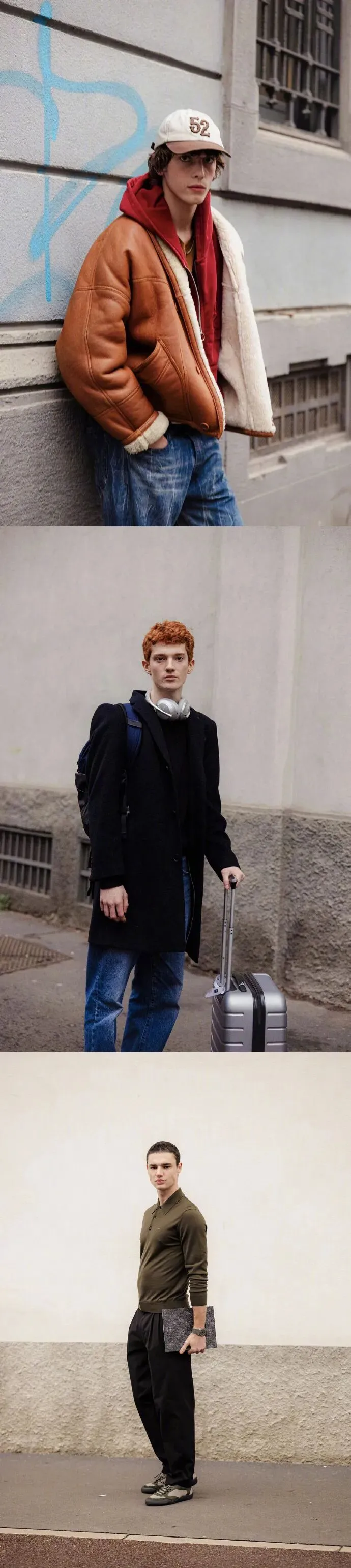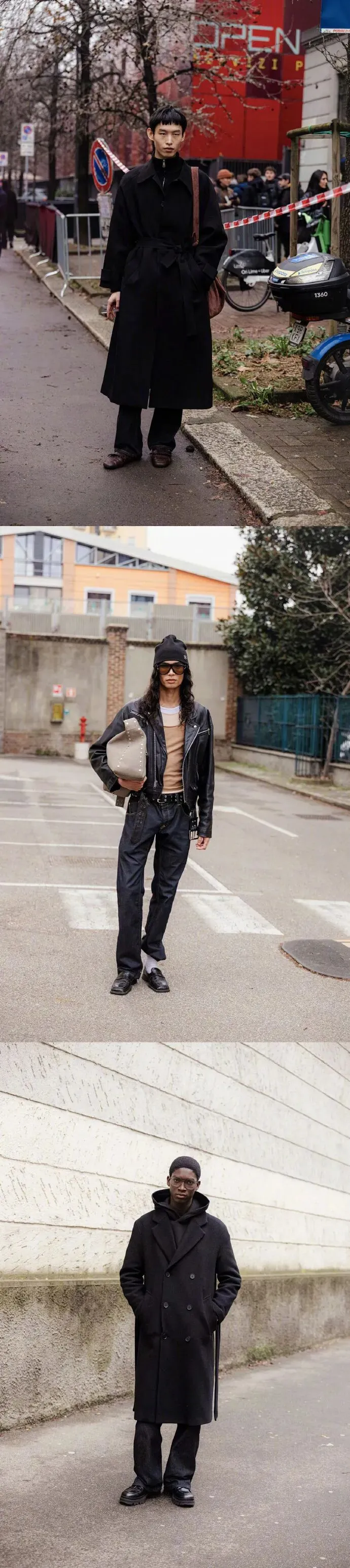 无论是赶场秀间的匆忙街头,还是在米兰广场的悠闲停留,模特们的穿搭都能 “场合适配”—— 赶秀时穿轻便的短款夹克 + 休闲裤,方便行动;驻足拍照时则换上廓形大衣,靠版型撑起镜头感。这种 “随性却不随意” 的状态,刚好戳中米兰男装周街拍的核心:时尚不是摆拍,而是融入日常的自然表达。