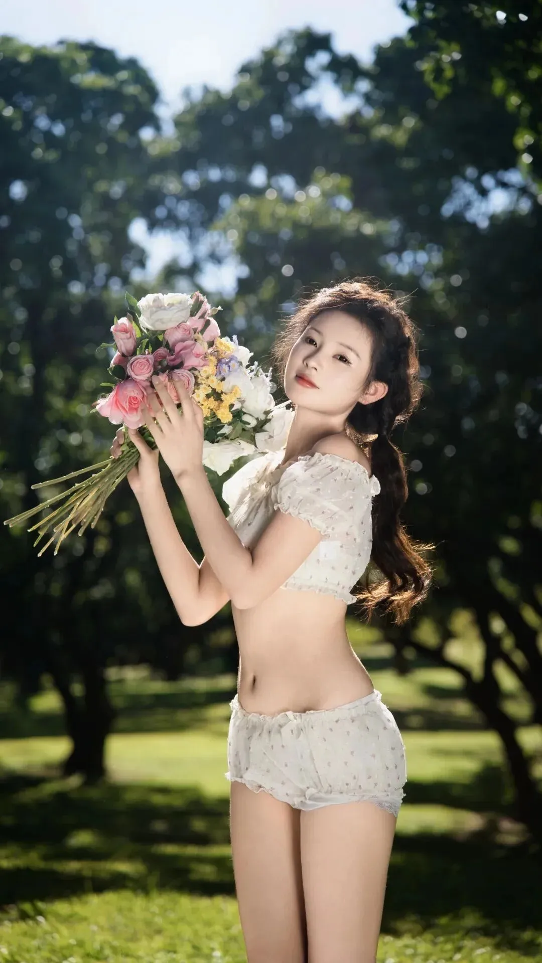 捧着花束转身的瞬间,整个夏天都开在她怀里。白色波点套装在绿荫里格外清新,高高束起的马尾随着动作轻轻摆动。那束花热闹得很,粉的、白的、黄的,挤挤挨挨地盛放着,映得她脸颊也泛着淡淡红晕。背景的树林成了天然画框,光斑在花束上跳跃,有几片花瓣几乎要飘出画面。她侧头看向镜头的眼神里有小小的得意,像是在说:看,我把整个花园都偷来了。
