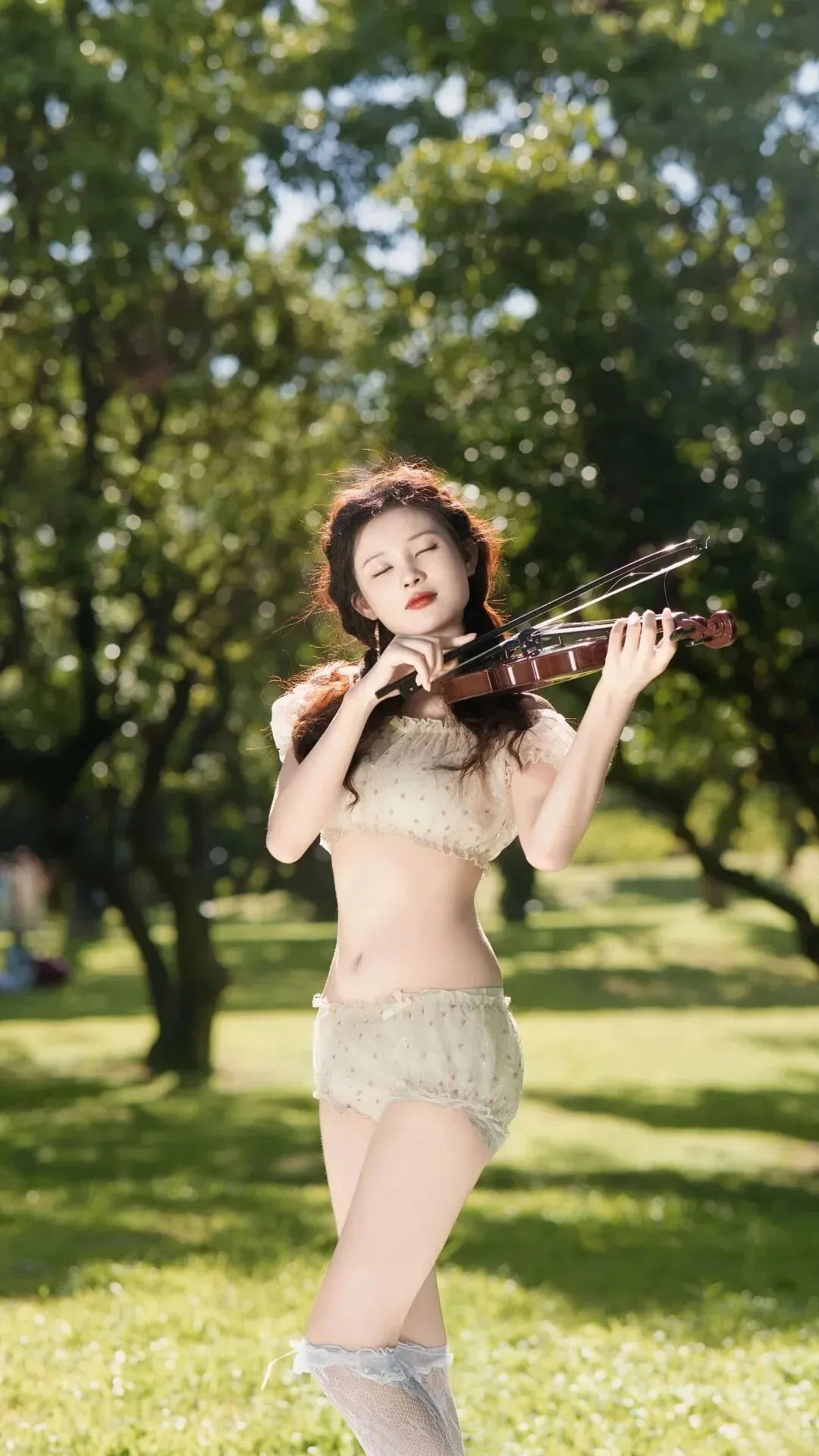 阳光穿过叶隙,在草地上投下斑驳的光斑。一位穿着白色蕾丝套装的女子静坐在绿茵之间,双眼轻闭,头微微后仰,像是要把整个夏天的温度都收进呼吸里。吊带上的蕾丝花纹在光线下透出细碎的光,裙边的层层花边散落在草地上,像不小心绽放的白玫瑰。长发如瀑般垂下,发梢几乎要触到青草尖。这一刻,她不像在拍照,倒像是这片草地生出的精灵,暂时停驻在人间,收集这个午后所有温柔的影子。