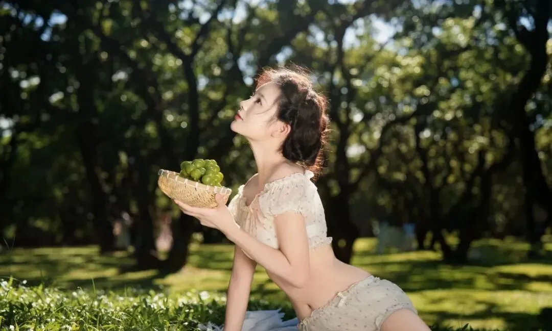 而当小提琴出现在画面里,整个故事有了音符。她闭目拉琴的姿势优雅得像幅油画,碎花上衣在绿荫里若隐若现。琴弓悬在空中,仿佛下一秒就会流淌出旋律。趴在白毯上时,身旁的花篮里玫瑰开得正好,粉色花瓣柔软地卷曲着。最后那张捧着青提篮的,她跪坐在草地上抬头望天,篮里的葡萄圆润饱满得像绿宝石。九张图连起来,是一个完整的夏日叙事:关于白月光般的少女,关于蕾丝与花朵,关于所有在绿野间闪闪发光的、稍纵即逝的美好瞬间。