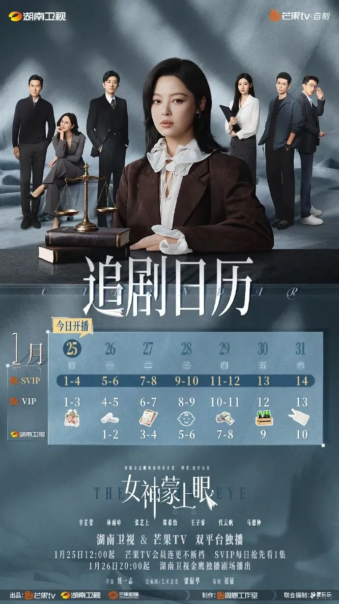 《女神蒙上眼》是由刘一志执导,辛芷蕾、林雨申领衔主演,湖南卫视、芒果TV出品,麦乐乐影视文化有限公司联合摄制的都市律政情感剧。