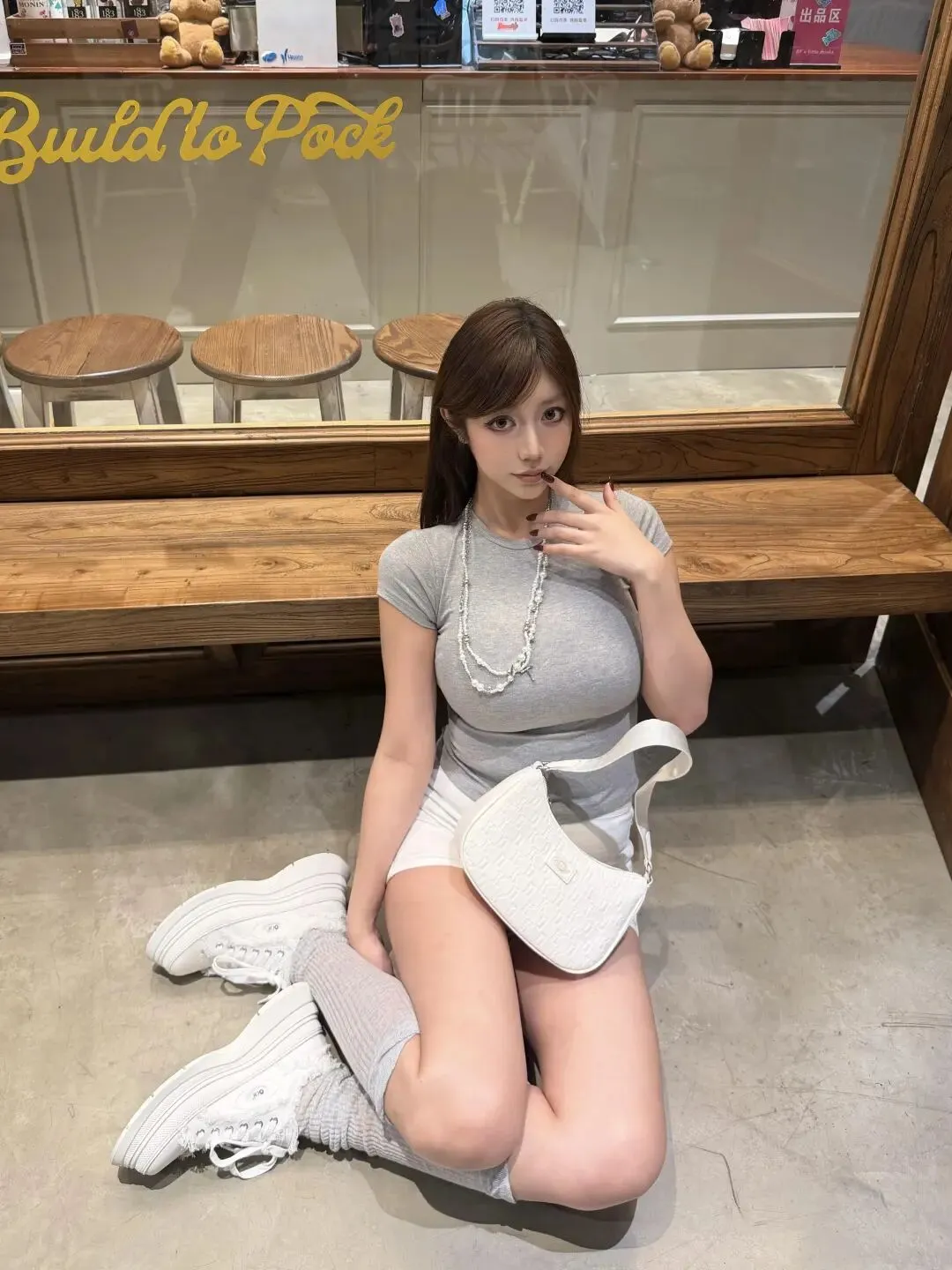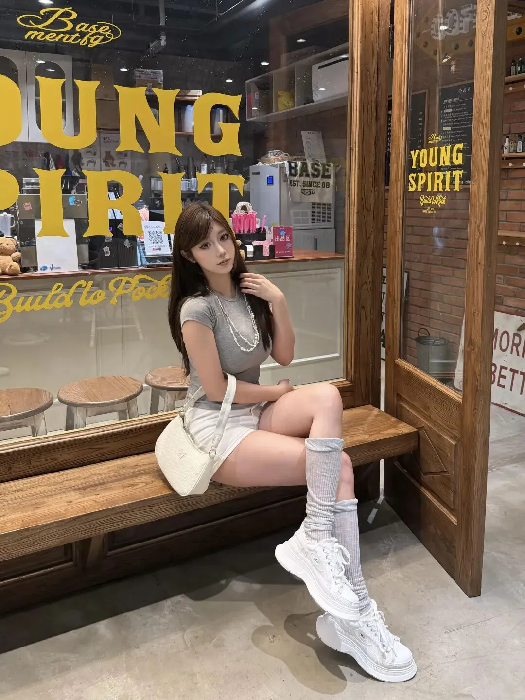 下装搭的是高腰米白色短裤,裤腿刚好卡在大腿最细的位置,视觉上直接把腿长拉到了腰线上,软牛仔的面料还特别藏肉,胯宽或者腿上有小肉肉的姐妹都能放心穿。脚上的浅灰堆堆袜是点睛之笔,长度到小腿肚,刚好遮住小腿最粗的地方,和灰色上衣呼应得特别巧,再踩一双厚底小白鞋,既显高又舒服,逛一天街都不会累。最妙的是她选的这个米白腋下包,皮质软软的带点压纹细节,和整套的浅色系完全融合,不抢戏但又足够精致,让整套搭配看起来是花了心思但又没费力气的松弛感。