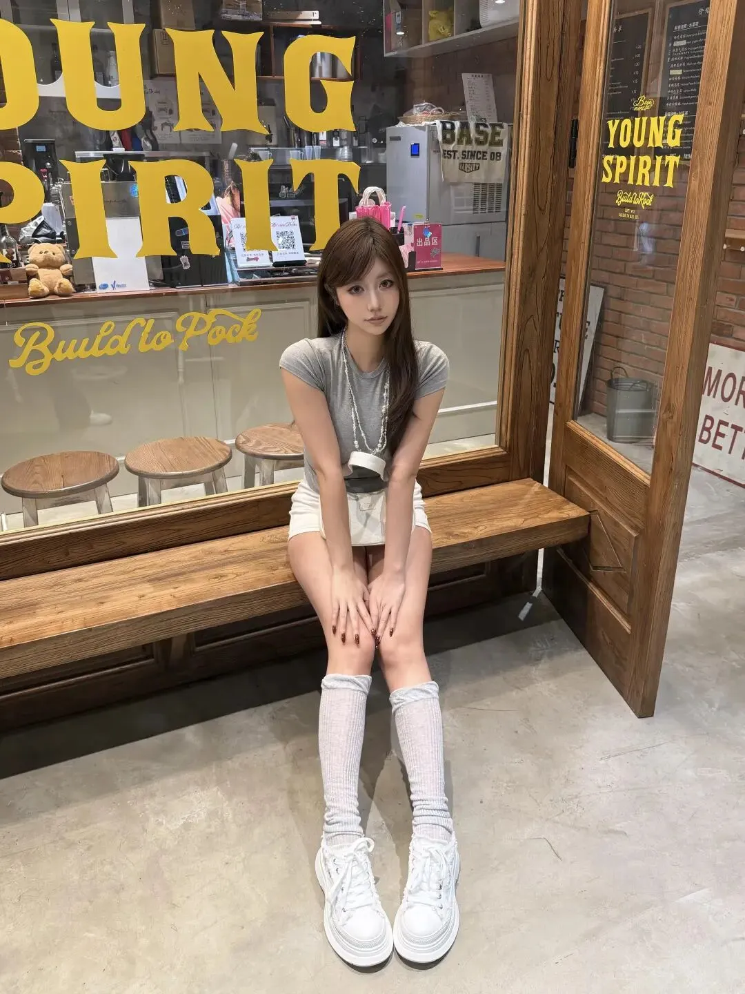 其实这套穿搭的精髓就在于“同色系做层次”,从浅灰上衣到中灰堆堆袜,再到米白短裤和包包,颜色过渡得特别自然,没有乱七八糟的撞色,全是温柔又显质感的低饱和色调。