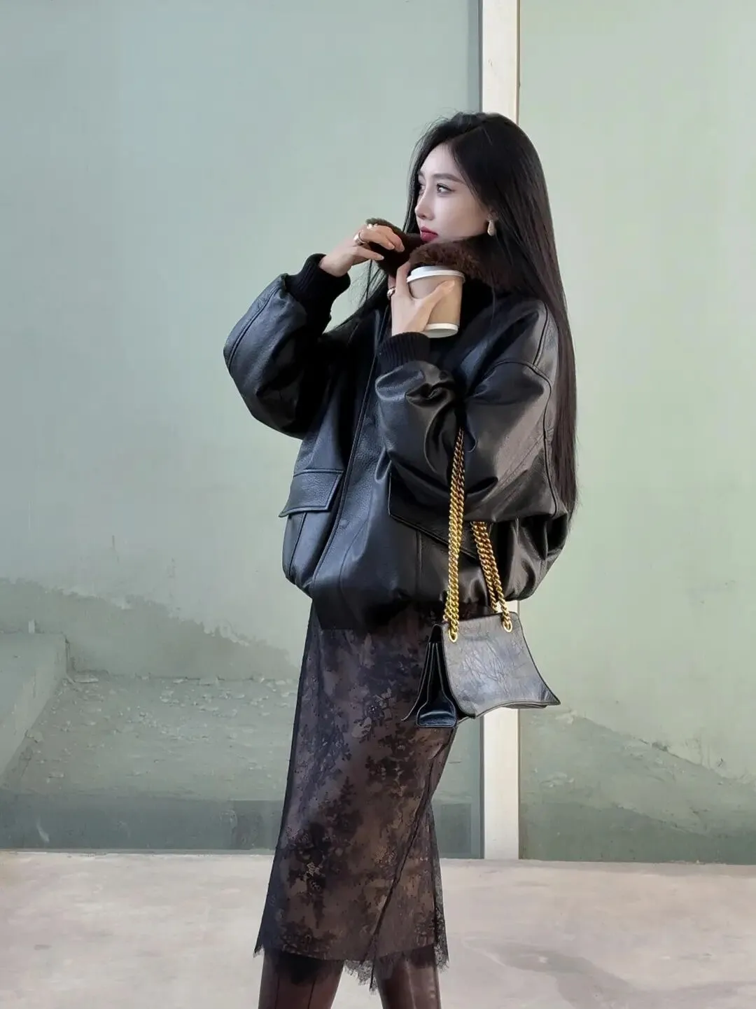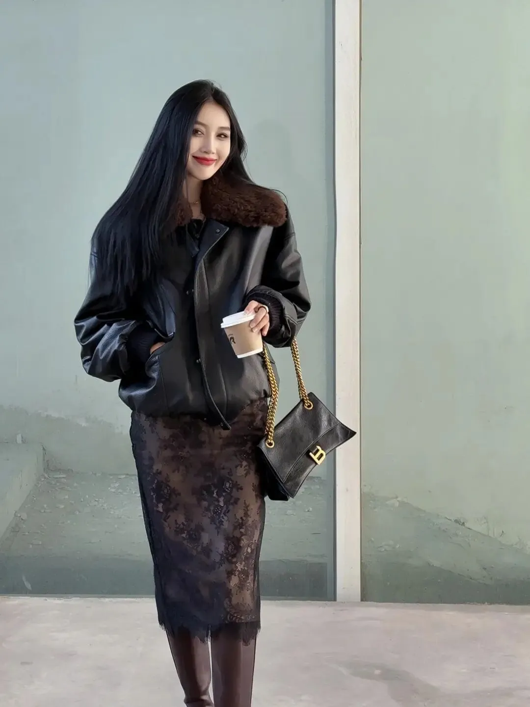 当前位置:首页>美女资讯>“黑色廓形皮衣+蕾丝半身裙+棕色长靴”,又酷又美,甜酷风时髦精