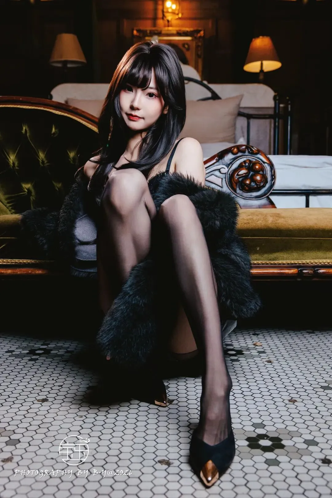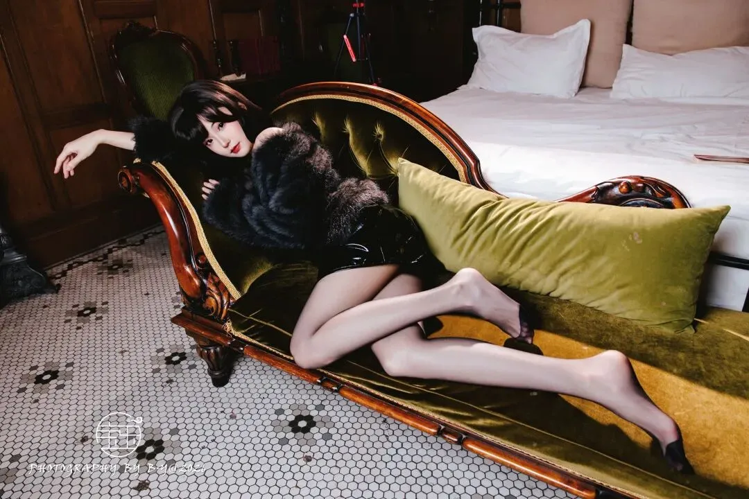 而最点睛之笔,莫过于那双修饰着修长美腿的黑色丝袜与尖头高跟鞋。丝袜的光泽感与皮草、蕾丝形成了丰富的材质对比,将腿部线条拉伸得更加笔直迷人。每一次抬腿与落足,都仿佛在演绎一场关于女性魅力的独舞,将优雅与性感诠释到了极致。