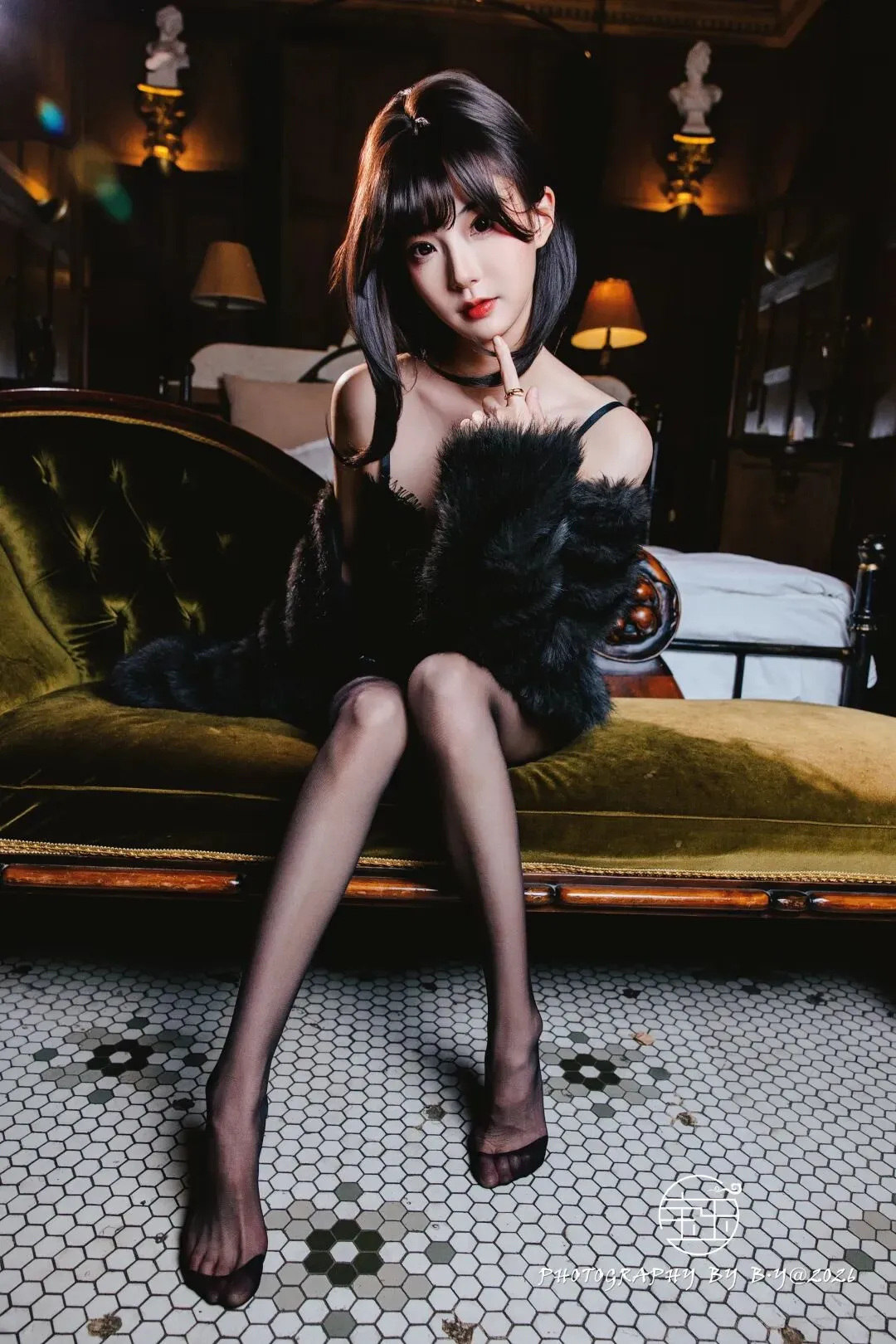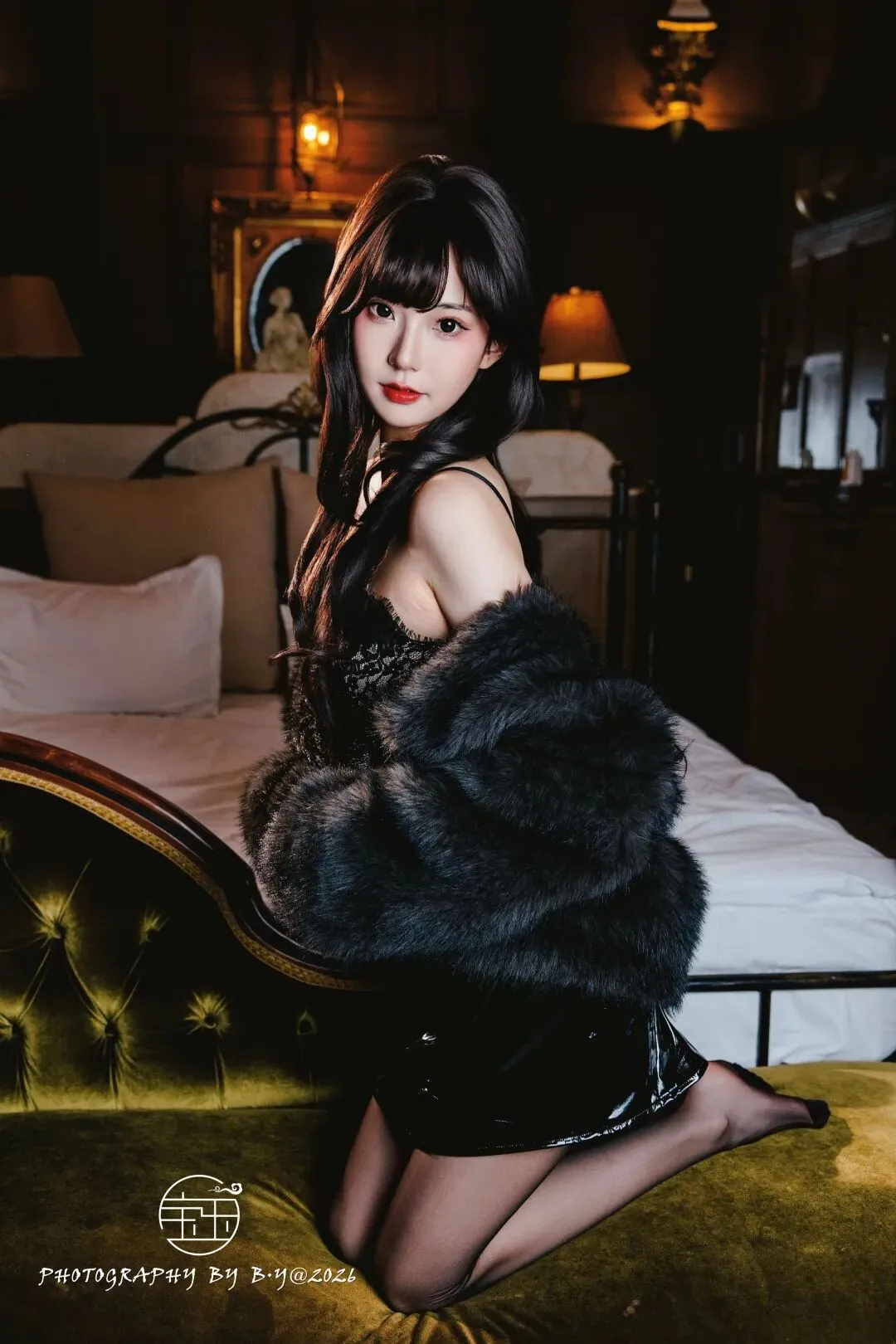 这组造型的核心,无疑是黑色。她身着一件精致的黑色蕾丝吊带裙,蕾丝的细腻与透视感,若隐若现地勾勒出曼妙的身材曲线,既神秘又充满女性魅力。外搭一件质感丰厚的黑色皮草披肩,随意地搭在肩上或环抱胸前,瞬间提升了整体的奢华感与气场,仿佛是旧上海的名媛,又像是好莱坞黄金时代的电影明星,风情万种,华贵逼人。