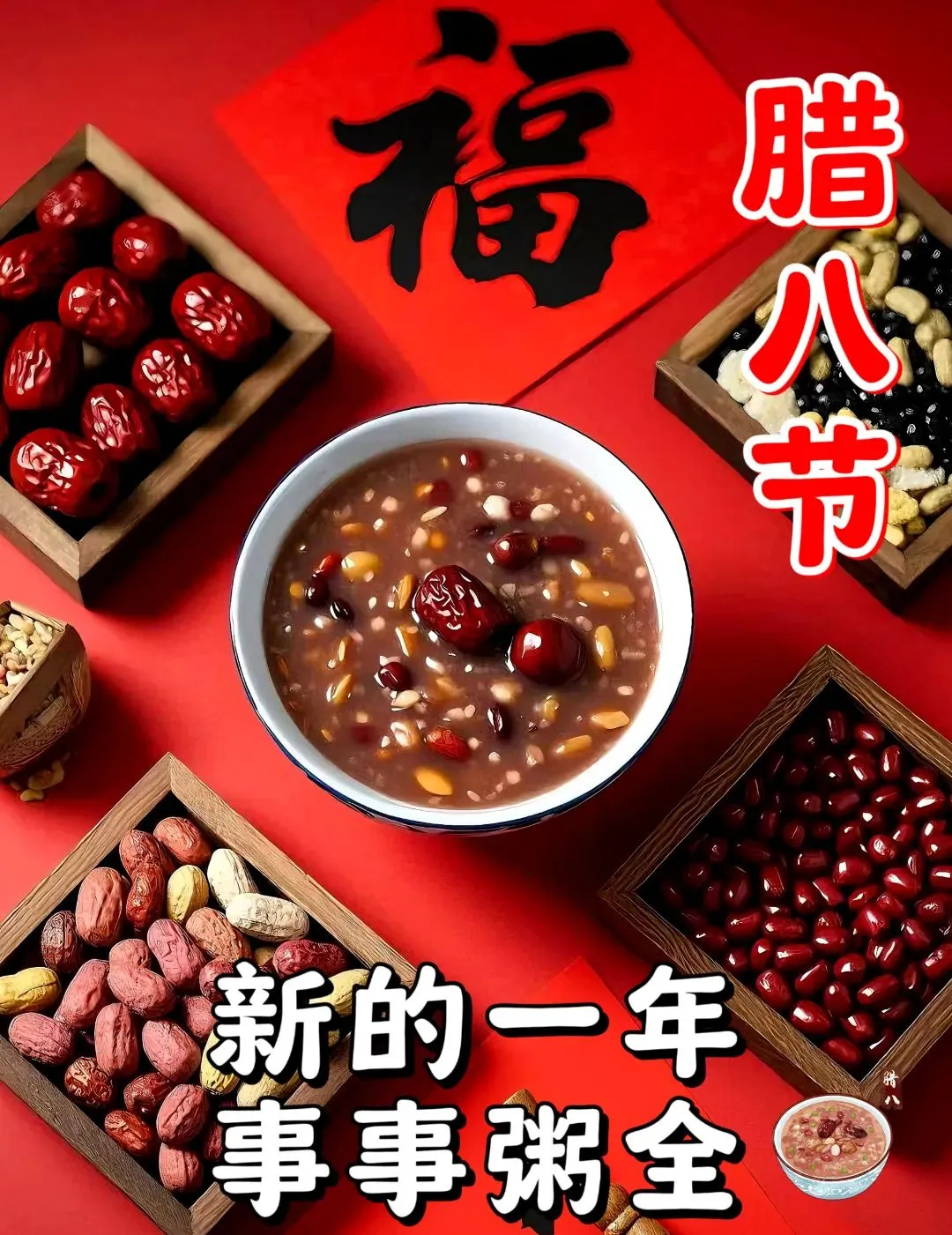 🍹腊八节里腊八粥,家家户户煮粥好。💖瓜果蔬菜来报到,五谷杂粮一起闹。🍒一碗腊八端上桌,情深意重碗中笑。🌞甜甜美美笑声溢,热热闹闹腊八节。🍁美味喷香腊八粥,妖魔疾病不缠绕!☘