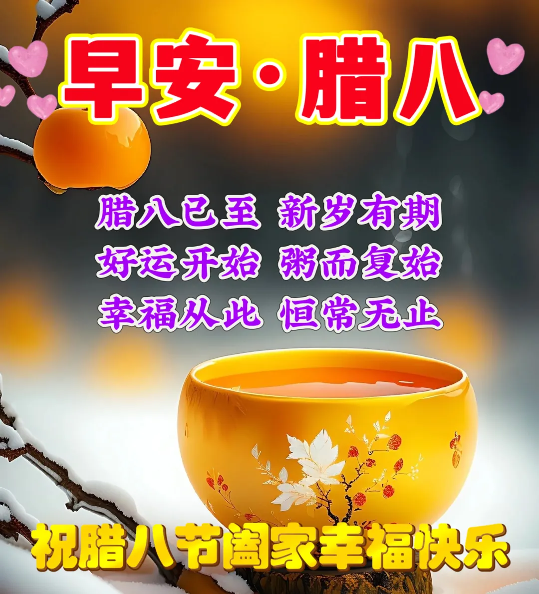 🌈“粥” 而复始又一年,🌞过了腊八就是年,💐一岁一安皆团圆,🌅愿你有衣暖寒冬,有人伴朝夕,万事皆 “粥” 全,岁岁常欢颜!🍁腊八节快乐!🍹
