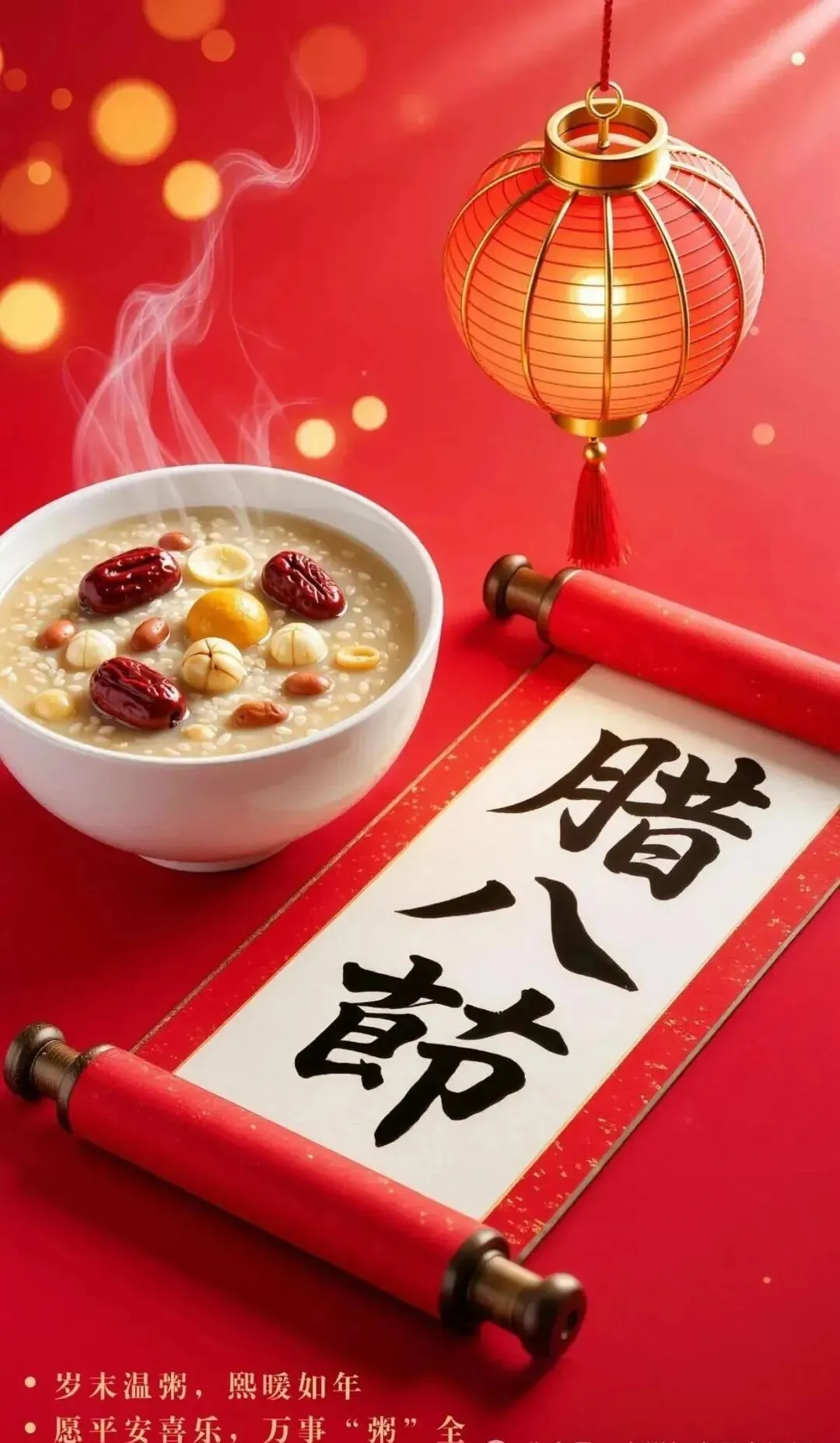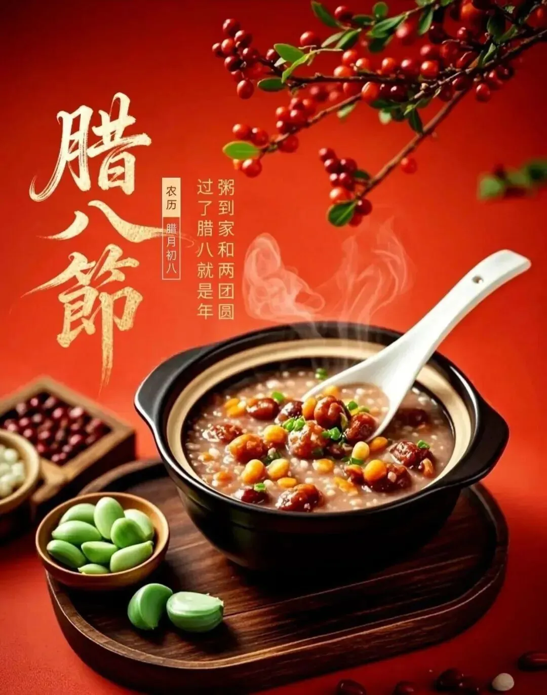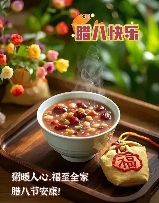 腊八吉祥如意粥,幸福美满汤汁稠。数九寒天北风啸,彩色粥饭平安搂。红艳佳肴祥瑞凑,热粥暖心冻不愁。寒冬腊月定能胜,辣粥美味祭天酬。祝朋友:腊八粥节愉悦享,瑞雪飘洒送吉祥。