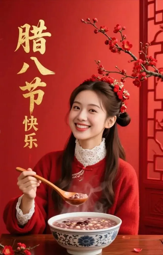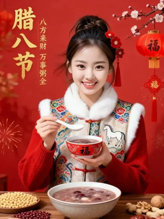 腊八粥香飘四溢,拟作春信报佳音。豆类如珠,糯米似玉,红枣如霞,共绘团圆美景图。愿君岁末年初时,心怀暖阳,不惧寒冬,步步生莲向春行,福运连连喜气添。