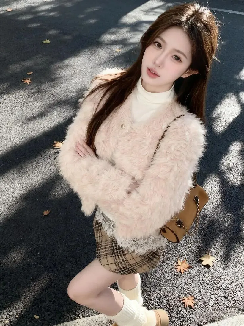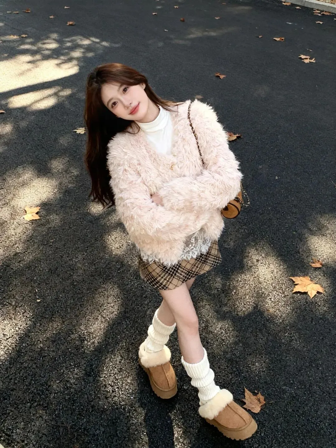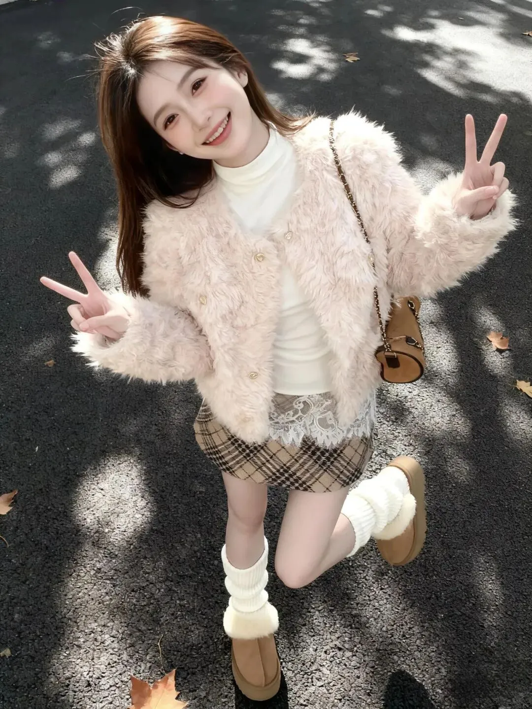 当前位置:首页>美女资讯>浅粉毛绒外套搭格纹蕾丝裙,今天是软fufu甜妹一枚呀
