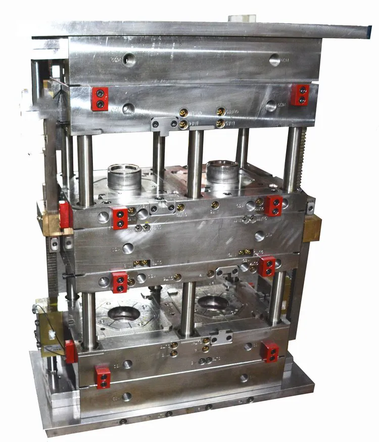1、与常规模具不同的是,叠层式注射模具的型腔是分布在两个或多个层面上的,呈重叠式排列,即相当于是将多副模具叠放组合在一起。最常见的两层叠模通常是由两个单层的模具背对背安装而成,分模面通常依靠齿轮和齿条机构保持同步打开。