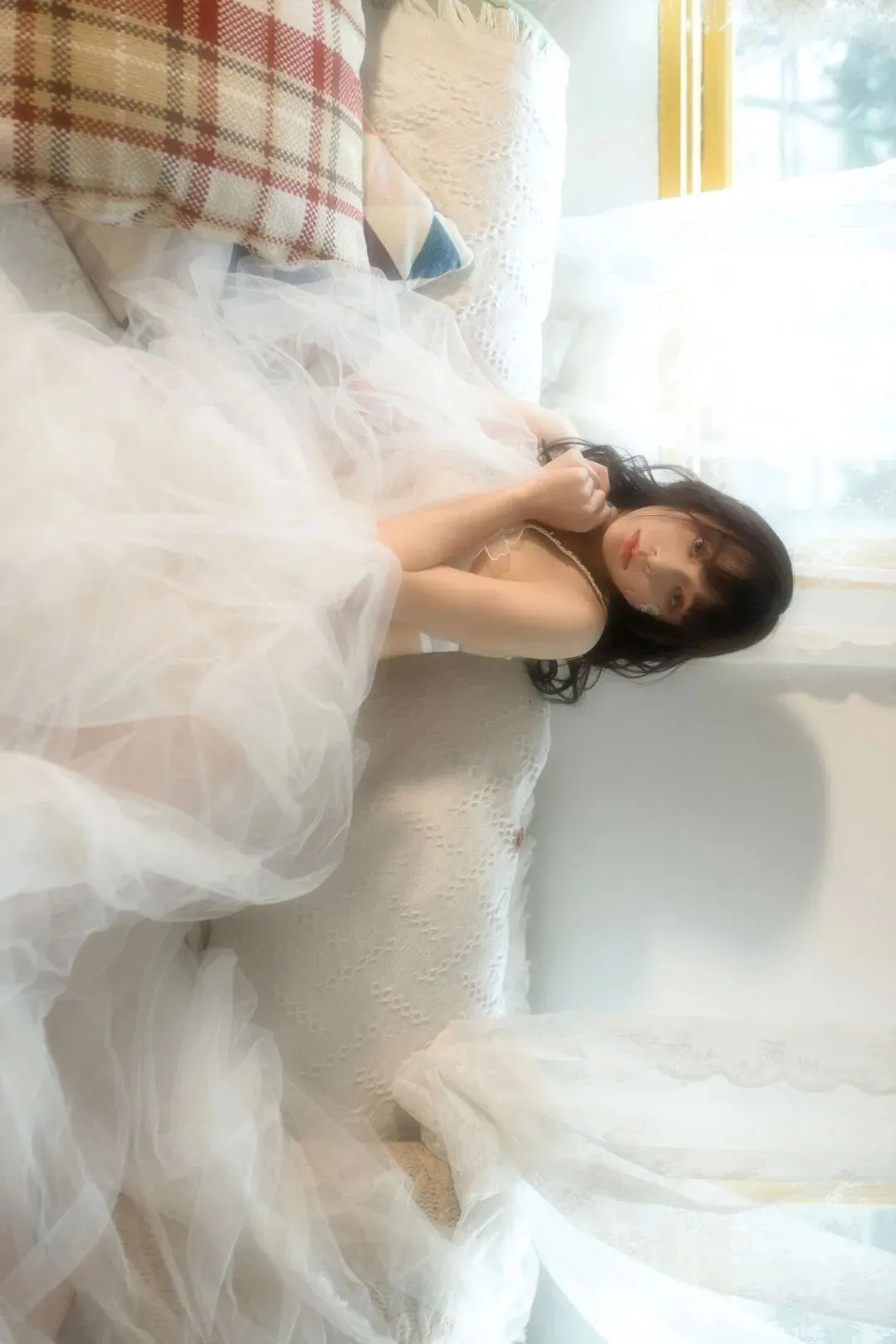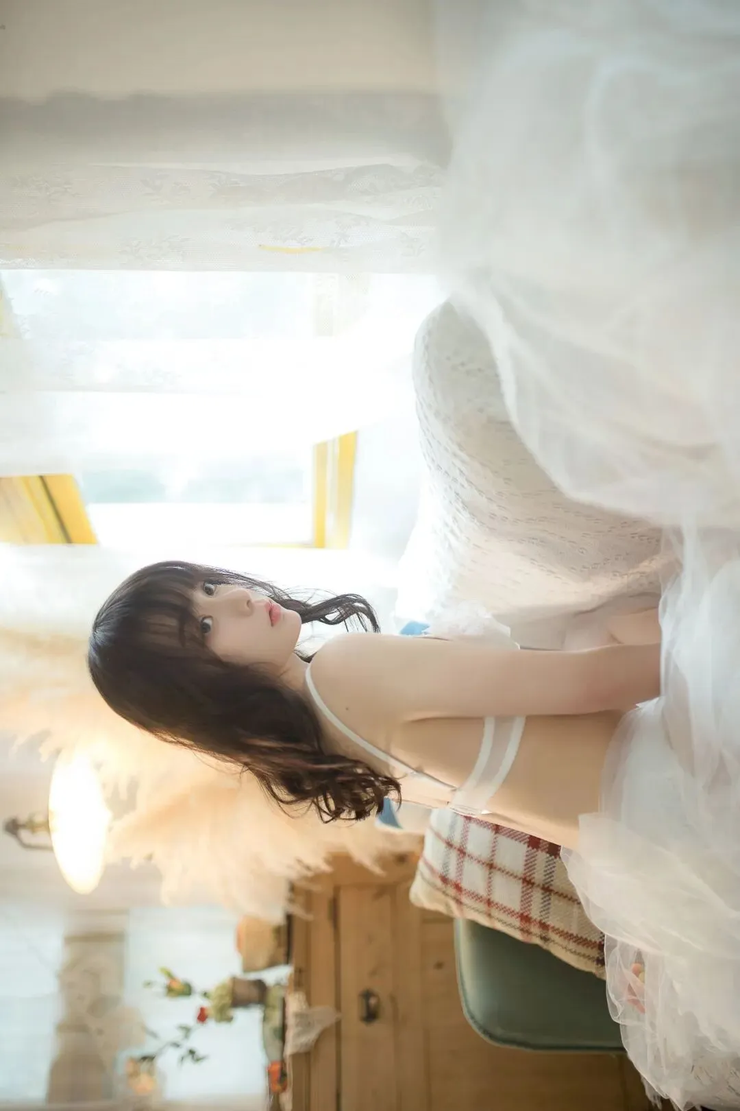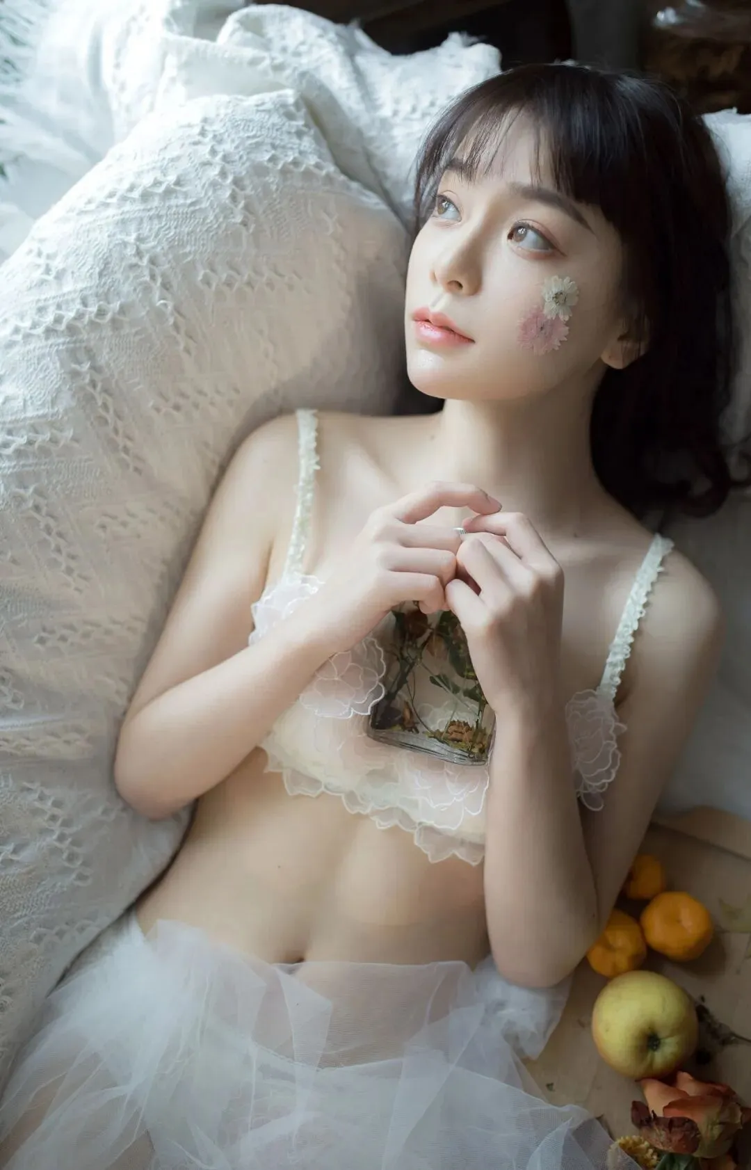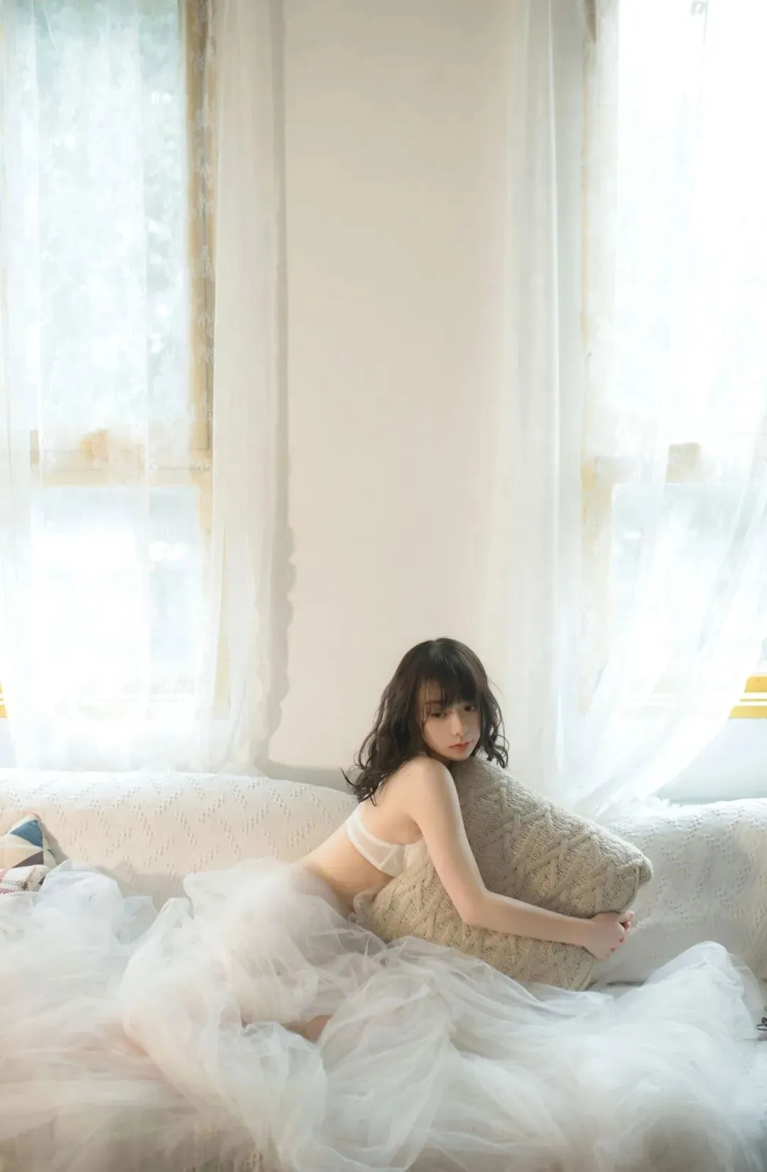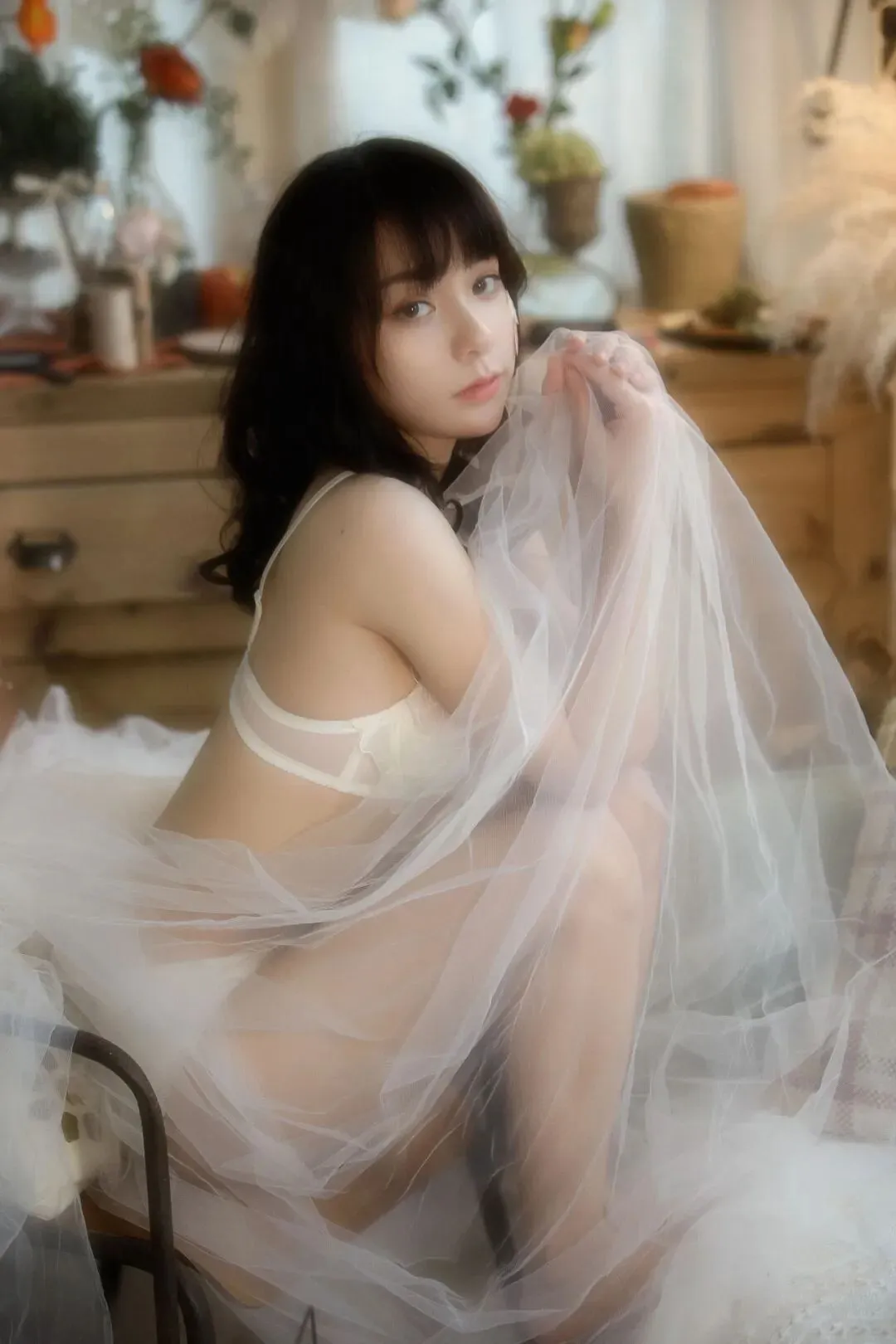 服装选用白色细带内衣,简约贴身的设计既呼应了纯欲调性,又不过分暴露,与纱幔的通透质感完美融合,让画面在柔媚中保持了干净纯粹的底色。整组照片没有浓烈的色彩或夸张的动作,却用松弛的情绪、柔润的光影和细腻的道具互动,把少女的清甜与慵懒揉进了镜头里,让人仿佛能感受到午后的微风和床榻上的软萌气息。