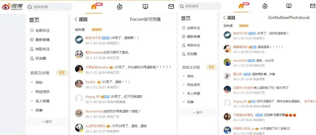 停留在2025年12月18日最后一条微博的账号“@ZeeNuNewPhotobook”,评论几乎都是退款维权信息: