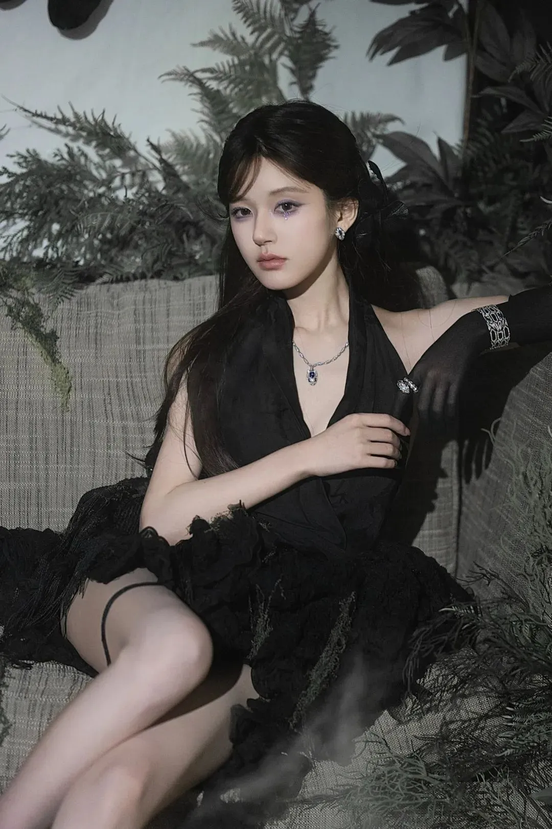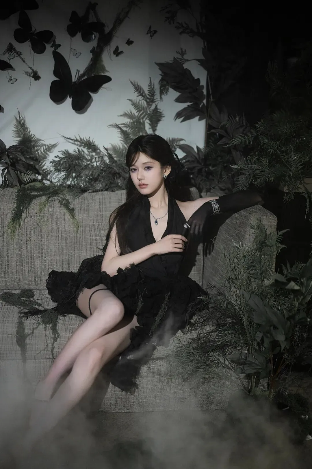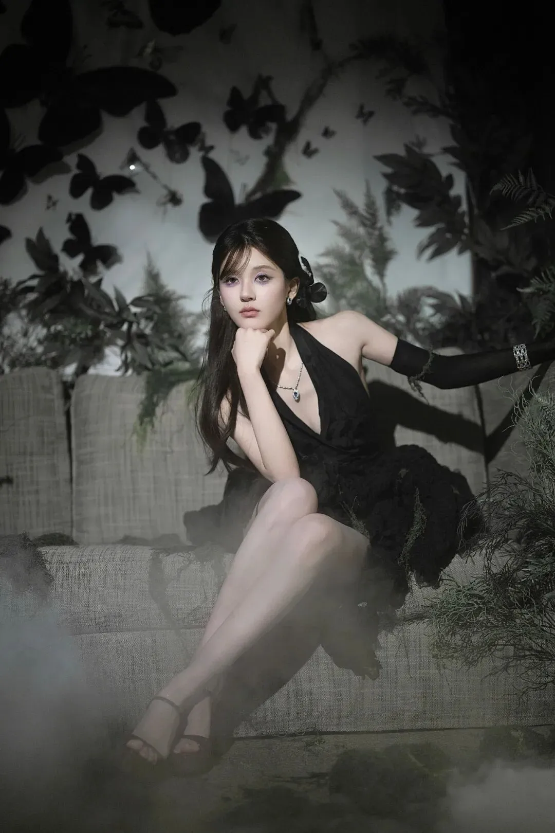 赵露思这组暗黑系写真也太有感觉了!一身黑色蕾丝短裙,搭配长手套和厚底凉鞋,整个人像从童话里走出来的“暗黑公主”。她坐在沙发上,双臂一展,腿又细又直,比例好到离谱。背景是黑蝴蝶和绿植,烟雾缭绕,氛围感直接拉满。脸型小巧,五官清秀,妆容偏冷调,眼神带点疏离感,但笑起来又很甜,反差感太强了!