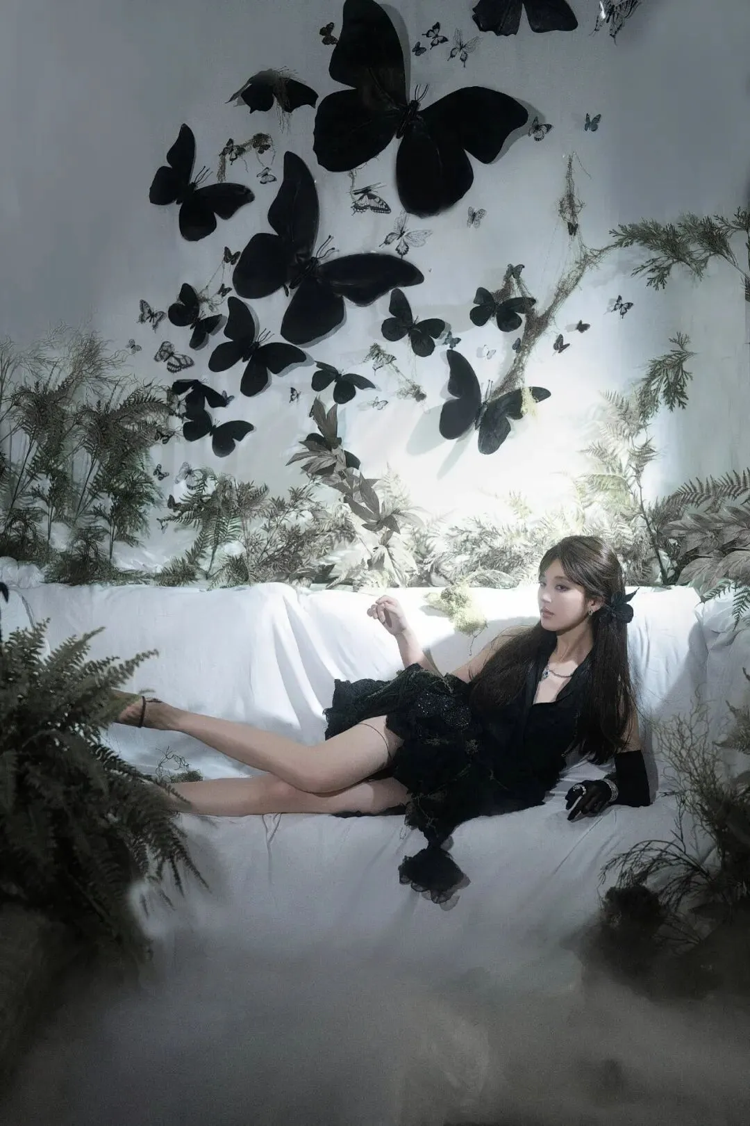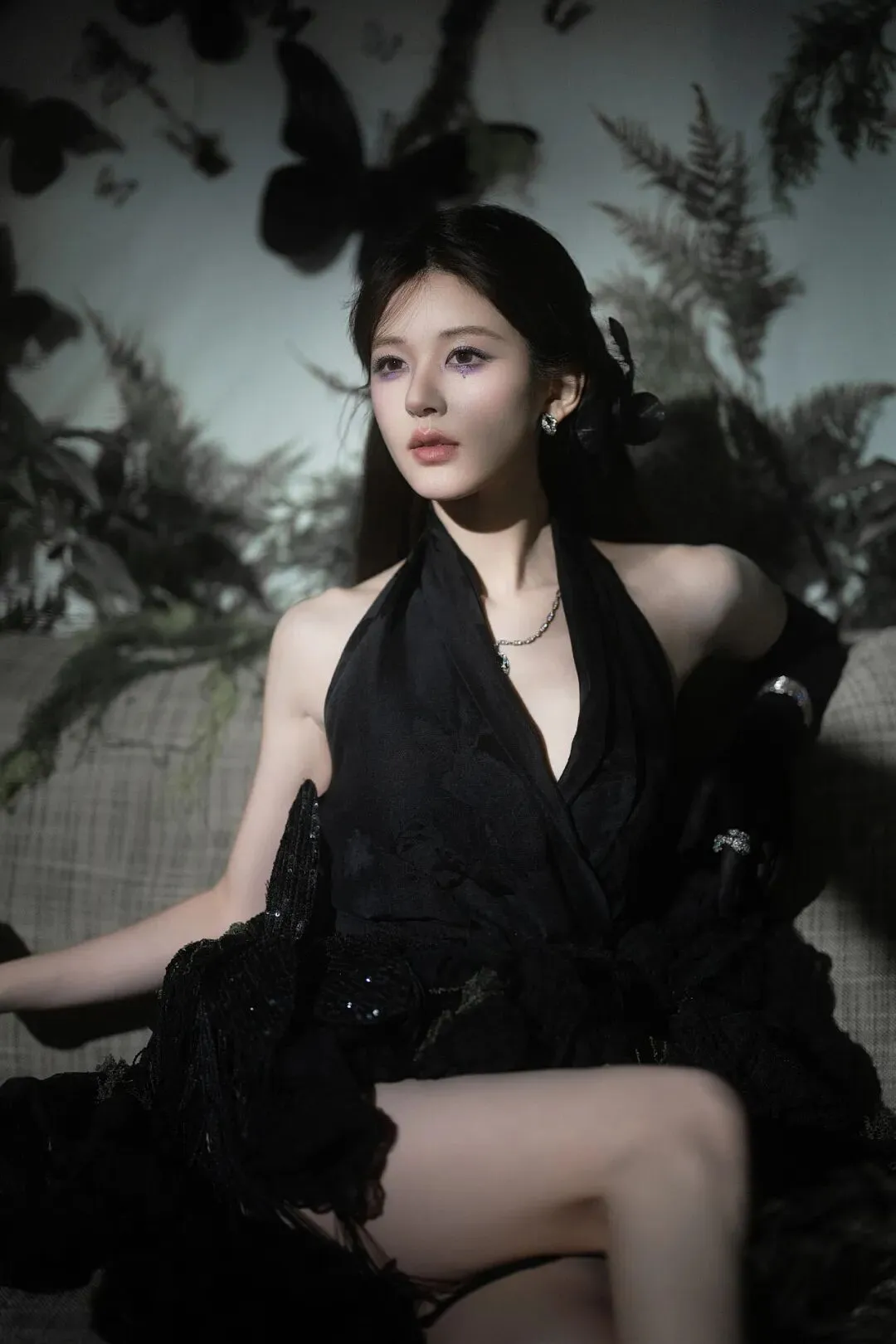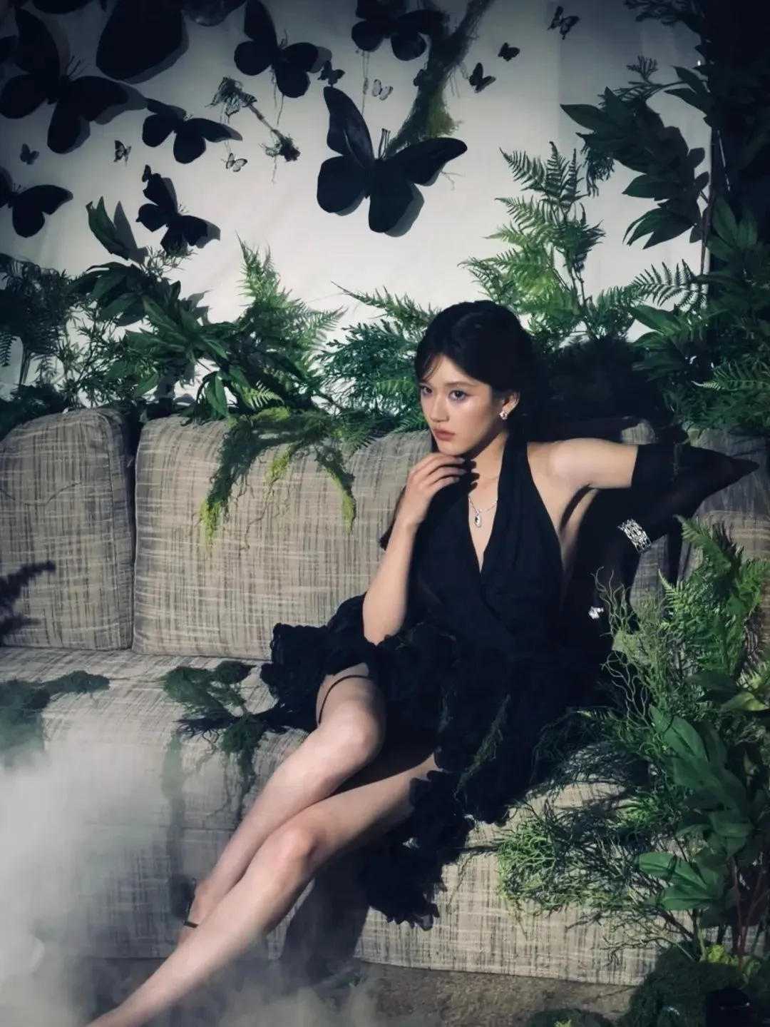 赵露思这组暗黑系写真也太有感觉了!一身黑色蕾丝短裙,搭配长手套和厚底凉鞋,整个人像从童话里走出来的“暗黑公主”。她坐在沙发上,双臂一展,腿又细又直,比例好到离谱。背景是黑蝴蝶和绿植,烟雾缭绕,氛围感直接拉满。脸型小巧,五官清秀,妆容偏冷调,眼神带点疏离感,但笑起来又很甜,反差感太强了!