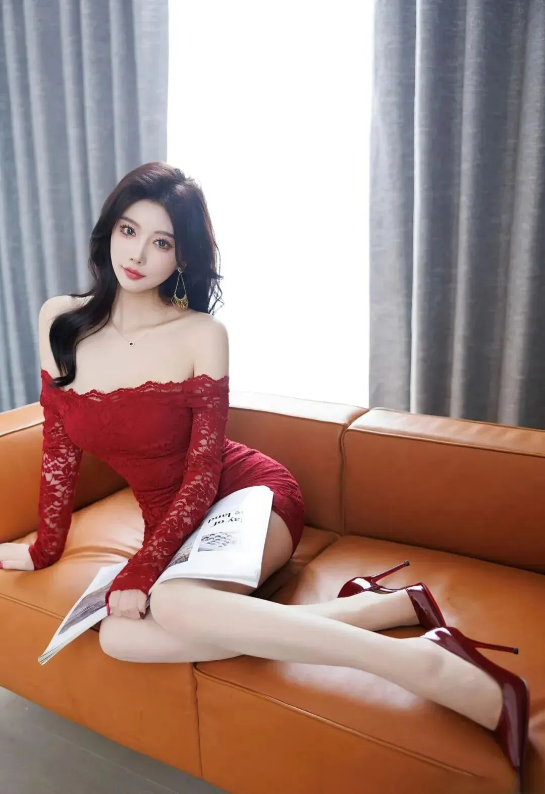 蕾丝红裙,香雪透轻纱 ,大白腿吸睛!