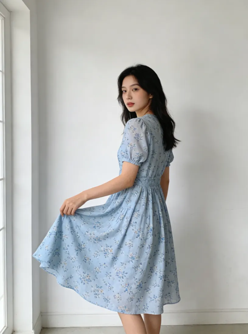 女装模特图为室内白墙背景,身着浅蓝色碎花连衣裙,侧身撩裙摆姿态自然,适配春夏风格;需替换为海边实景打造度假风,保留模特主体、服装细节及原有姿态,适配春夏款种草图。