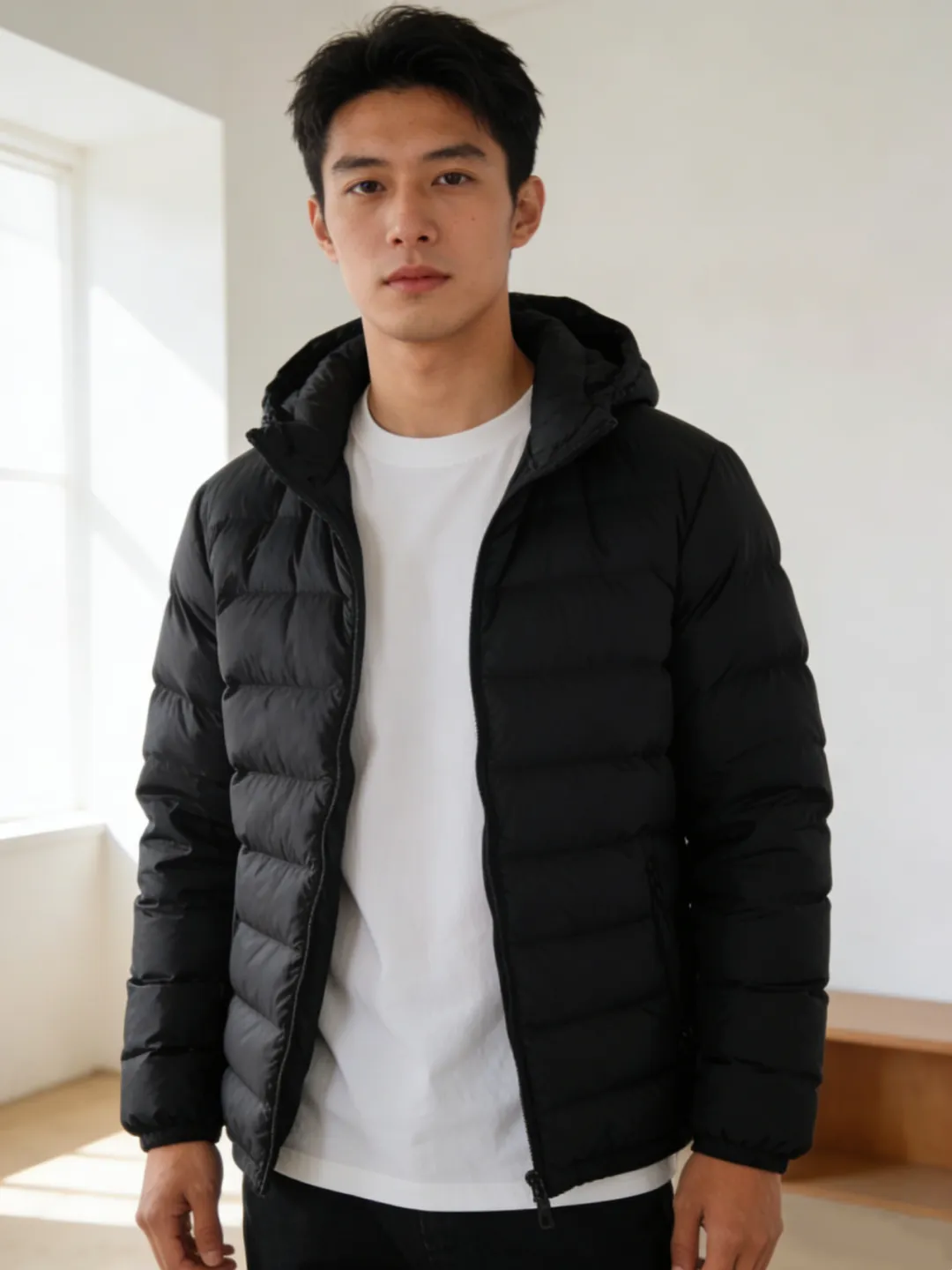 男装模特图,模特穿着基础款黑色羽绒服,内搭白色T恤,背景为简约室内场景;临近马年春节,需为服装增加节日氛围,适配春节期间的营销主图,同时保留模特姿态和服装版型。
