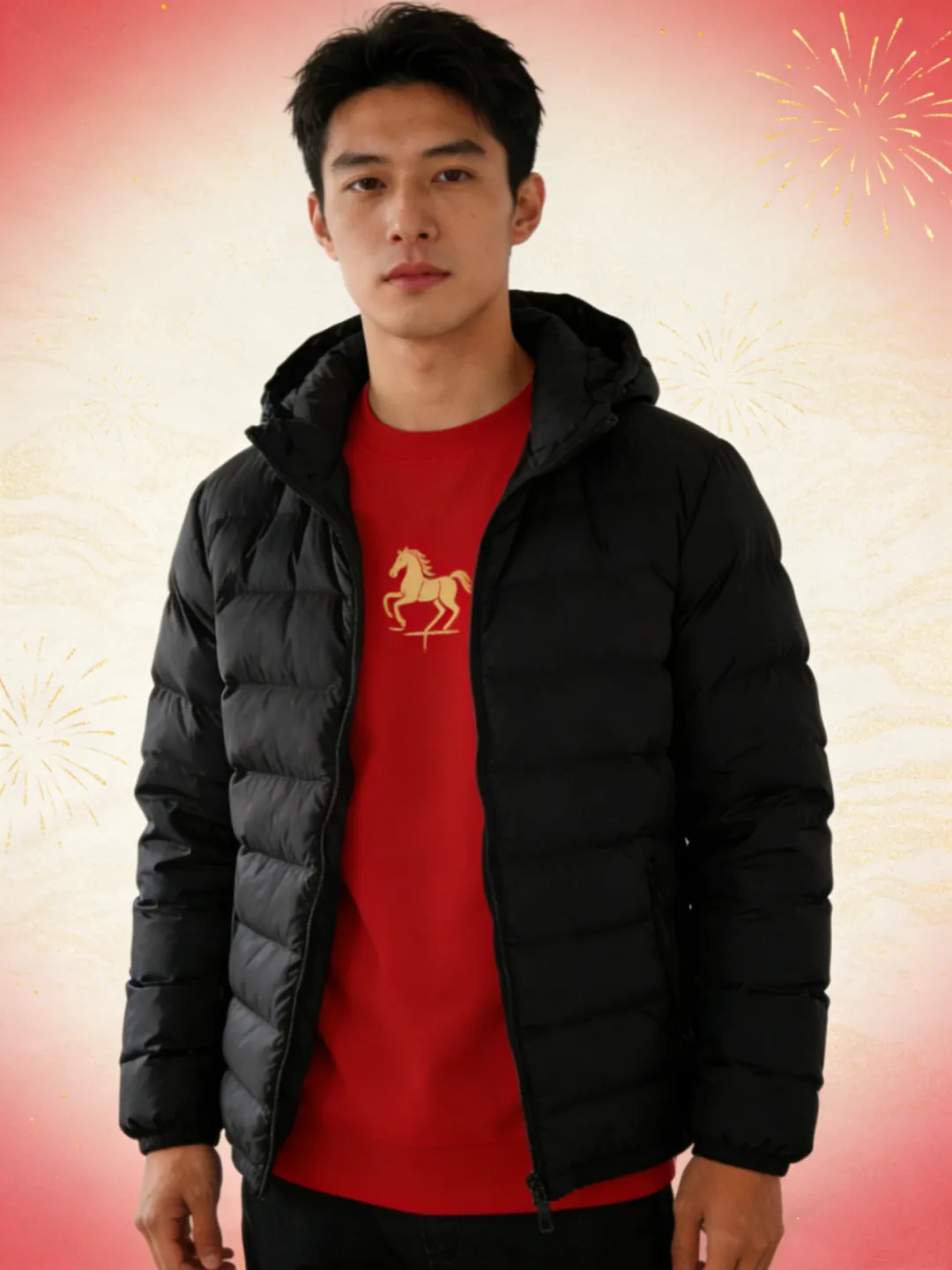 保留原图模特姿态、黑色羽绒服版型及质感;将内搭白色T恤替换为红色圆领卫衣,卫衣胸前添加简约金色马年元素图案(不夸张、不遮挡服装版型);背景优化为浅红色渐变(边缘淡红、中心偏浅),添加少量金色细碎烟花元素(点缀氛围,不杂乱)。