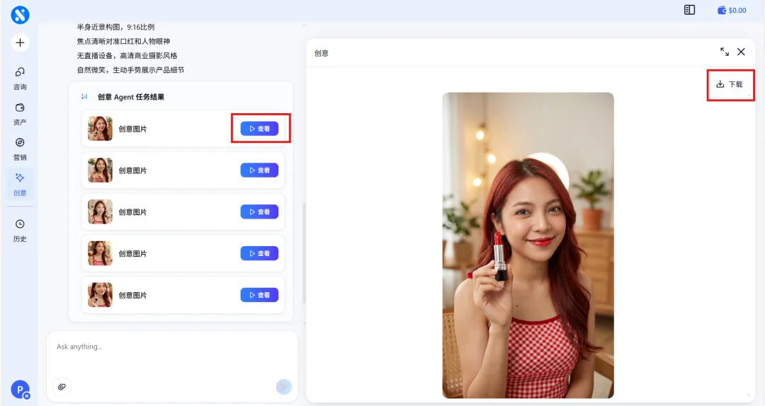 3.等待数字人手持商品参考图输出完毕,点击查看不同效果图,选取一张下载图片