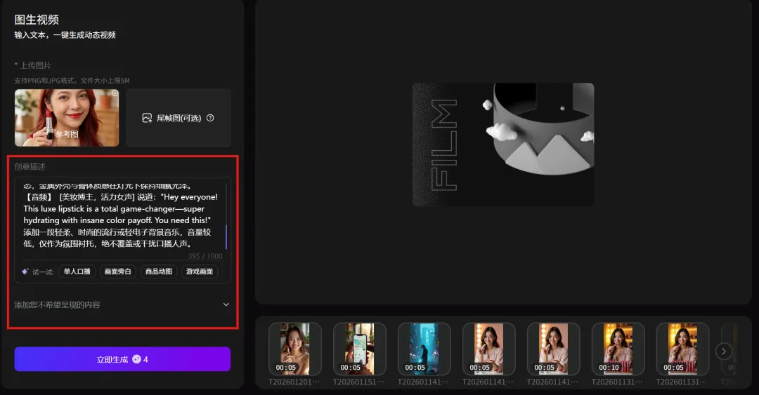 3.用文字描述希望视频达成的理想效果,包括数字人动作、数字人口播内容、音频效果等。可选择性添加你不想视频中出现的内容,排除不符合预期的元素。