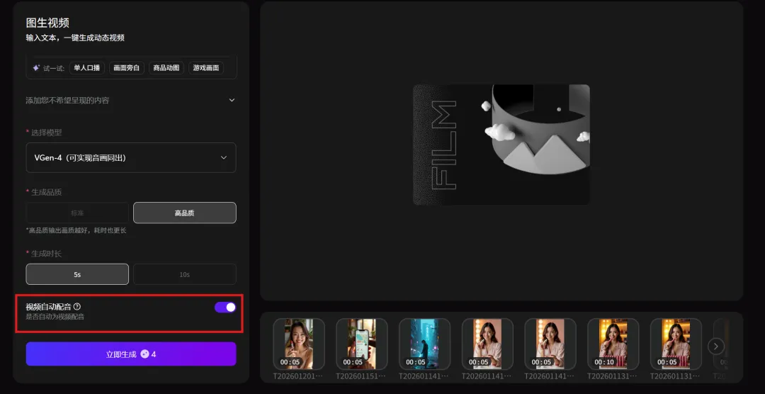 5.勾选为视频自动配音,可自动添加口播、背景音乐、特效音等声音,选择Kling 2.6模型时必须手动勾选否则生成视频无声音,Veo 3.1模型和Veo 3.1-fast模型通过指令控制自动配音。