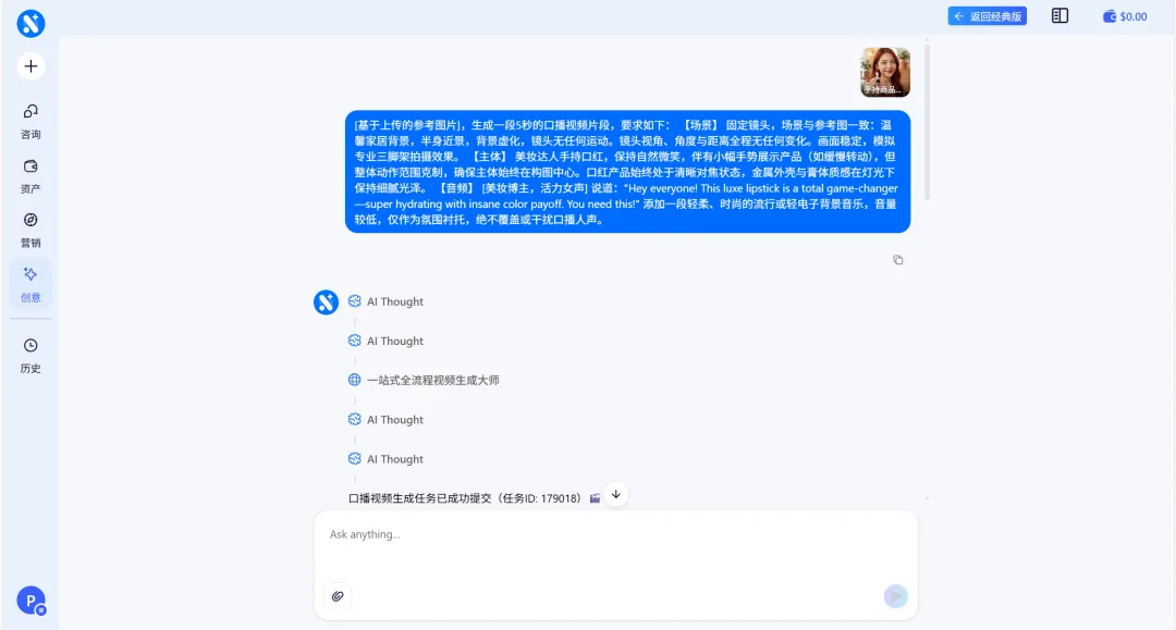1.上传数字人手持商品图片,在对话框用文字描述你希望视频达成的理想效果,发送对话
