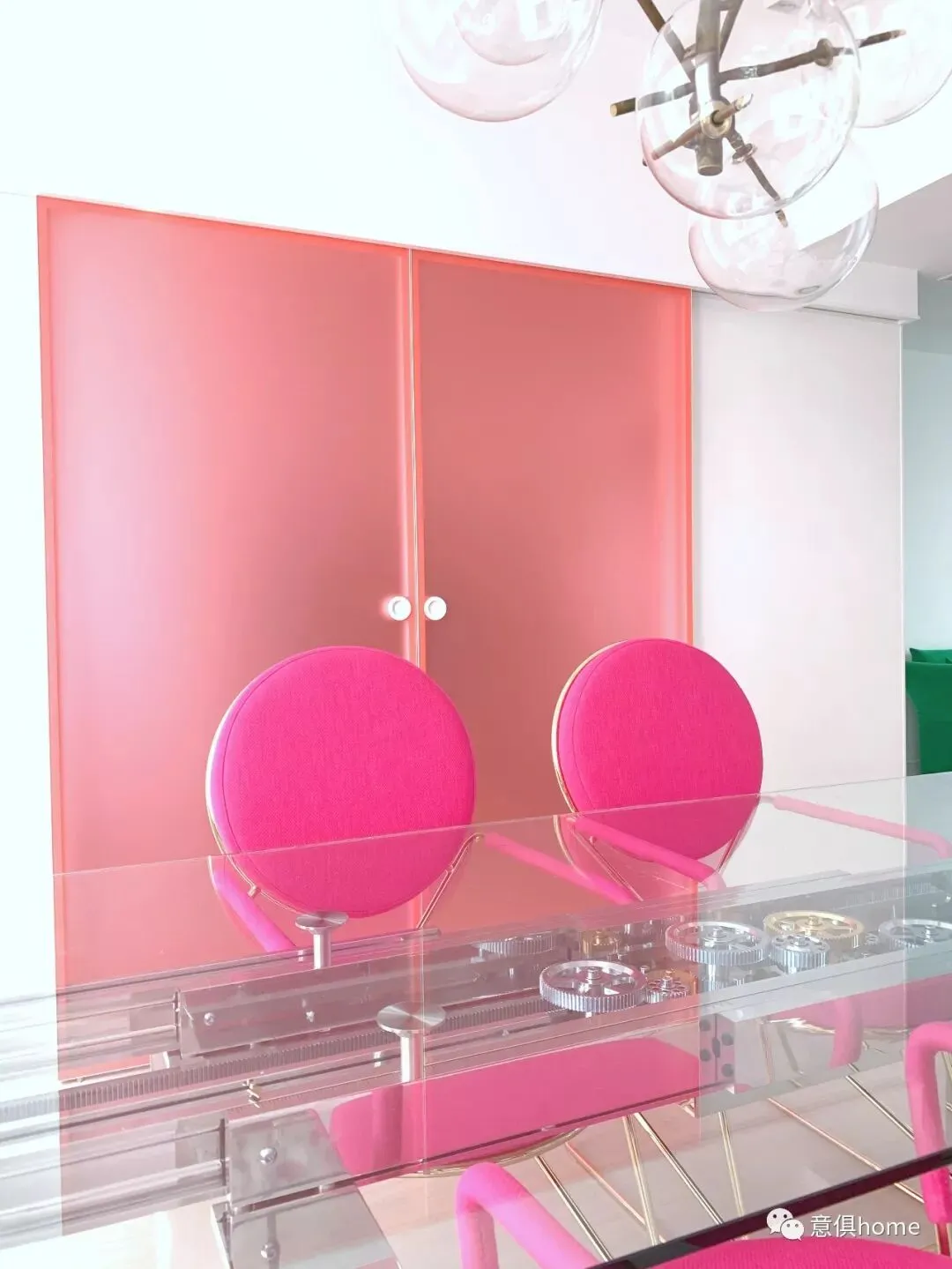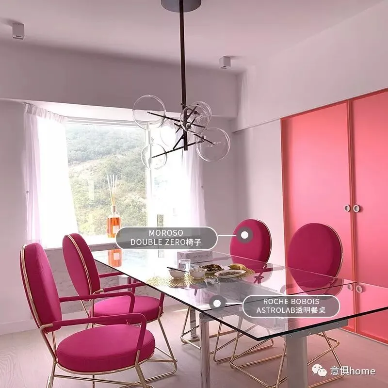 虽然这整个空间的亮色家具很多,但是家具与家具之间却做到了颜色的平衡,亮粉色的餐椅和橘粉色的背景门让空间的气质上扬,于是王冰冰通过极简的透明玻璃餐桌,来减弱了这些令人“喧闹”的元素。