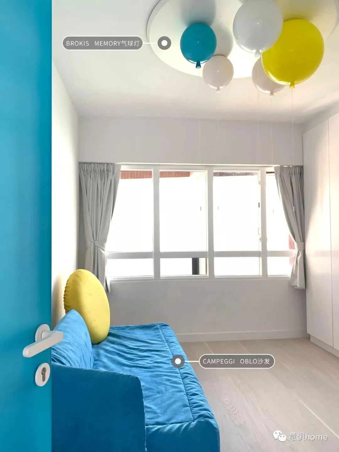 另一个房间的设计,是一个蓝色系的空间,BROKIS的MEMORRY气球吊灯让空间变得可爱起来。