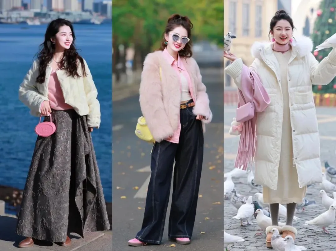 上图是博主:Luna教主的几套穿搭,粉色作为内搭或者配饰,你会发现,无论是与白色搭配,还是黑色以及其他颜色,粉色都有很好的中和作用,让其他颜色变得更加融洽,整体穿搭透露出温柔又减龄的气质。