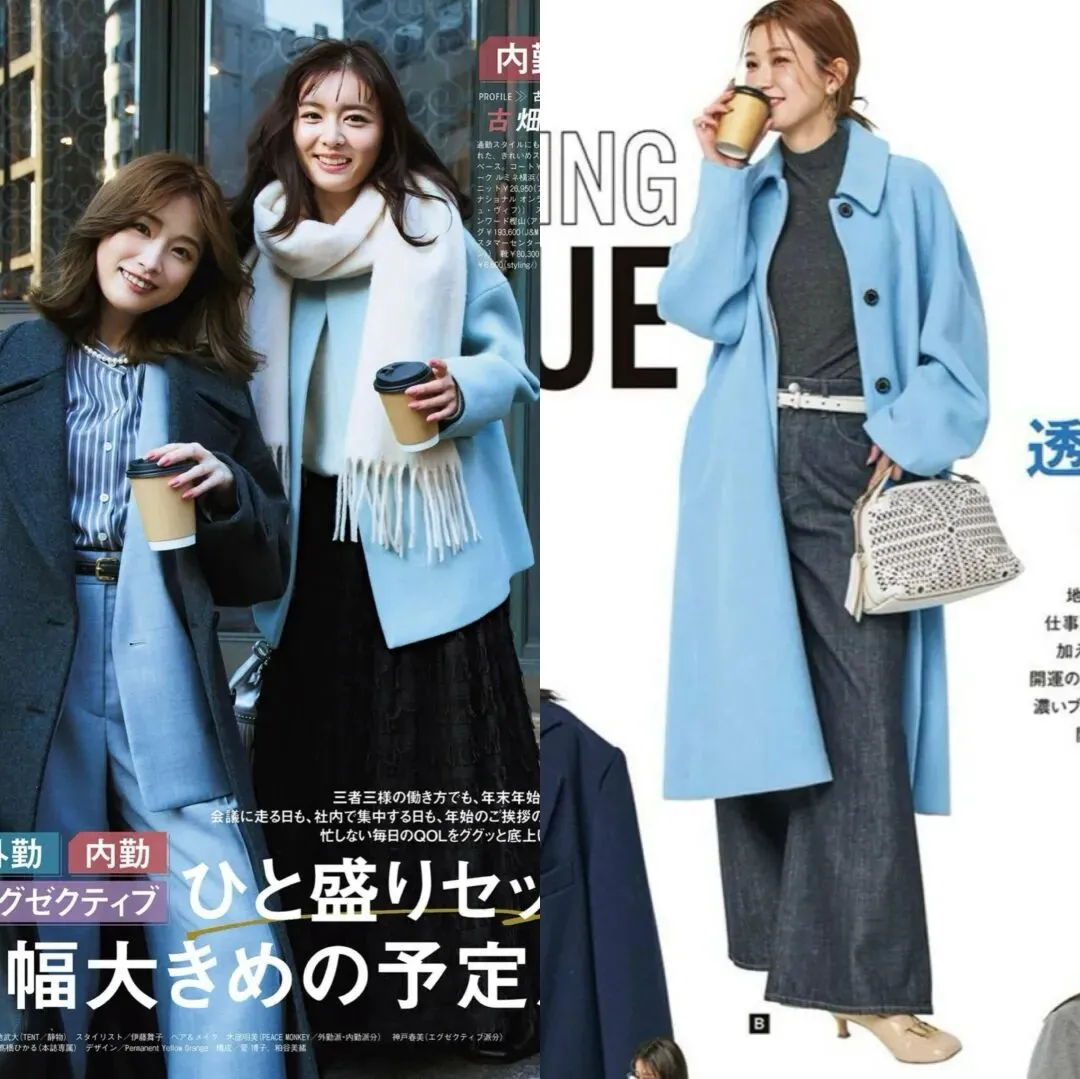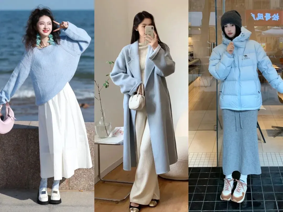 比如在我们日常穿搭中,可以选择浅蓝色毛衣搭配半身裙,超级显温柔的一套穿搭,浅蓝色长款大衣可以组合米白色内搭+阔腿裤,浅蓝色羽绒服搭配灰色针织裙也有非常时髦又减龄的效果,你会发现,浅蓝色与基础色搭配,非常的时髦百搭且温柔感满满。