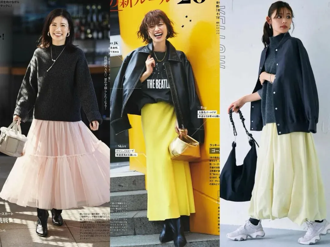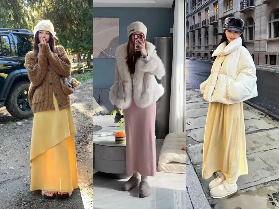 而在冬季穿搭中,很多人都会选择基础的黑白灰穿搭,想要在穿搭上与众不同且穿出时髦感,可以借鉴日杂模特的穿搭,你也可以变身时髦氛围感女神,比如燕麦色针织衫+黄色半身裙,米灰色毛绒外套搭配淡粉色针织裙,米色羽绒服+浅黄色半身裙等等,都是非常时髦减龄的冬季穿搭。