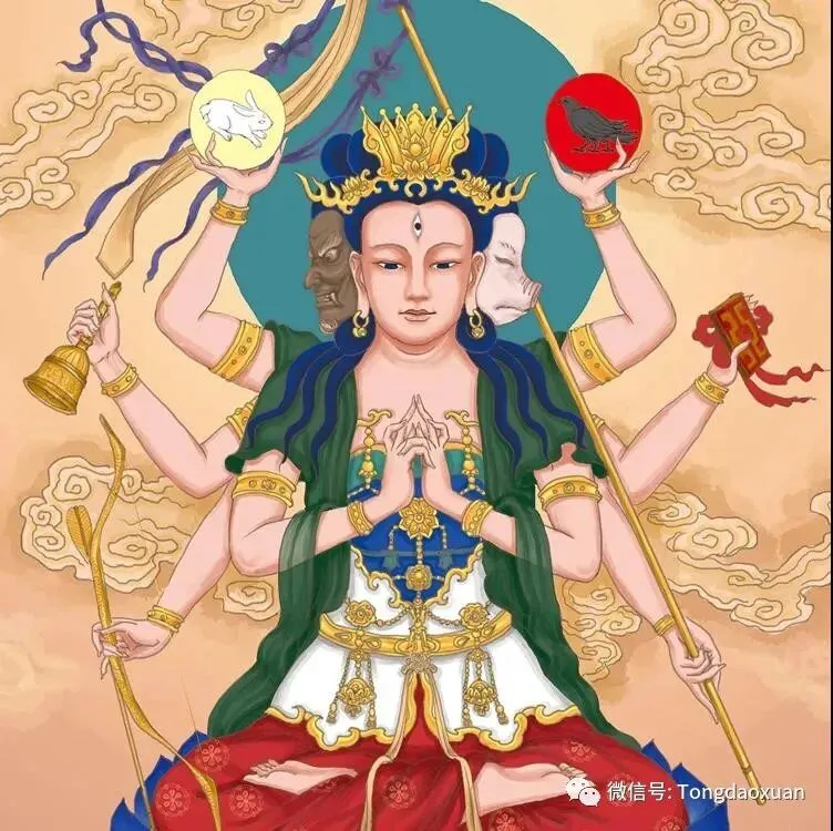 斗姆元君的神仙造像为三眼八臂,手中分别拿著太阳、月亮、宝铃、金印、矛、戟等作战兵器或法器。